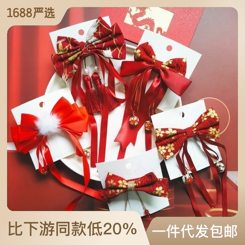 中国风复古儿童汉服发饰红色蝴蝶结发卡公主飘带发夹国潮流苏头饰