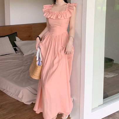 夏季新款 法式荷叶边方领吊带连衣裙女夏气质甜美雪纺长裙
