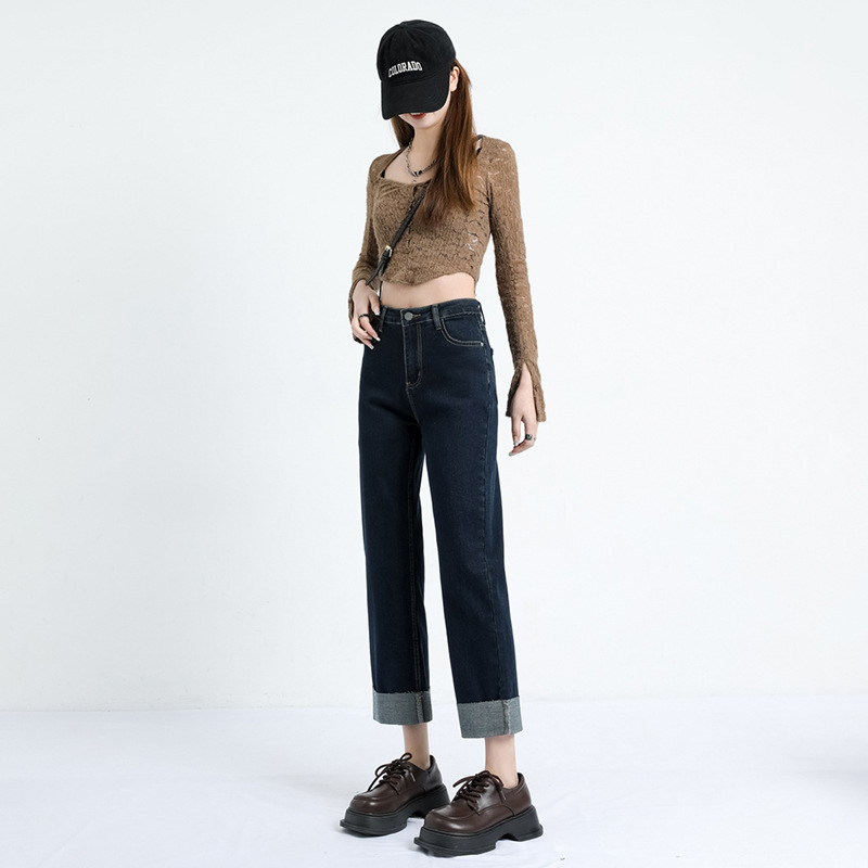 铭海秋季卷边牛仔裤女直筒宽松显瘦显高休闲高腰烟管裤