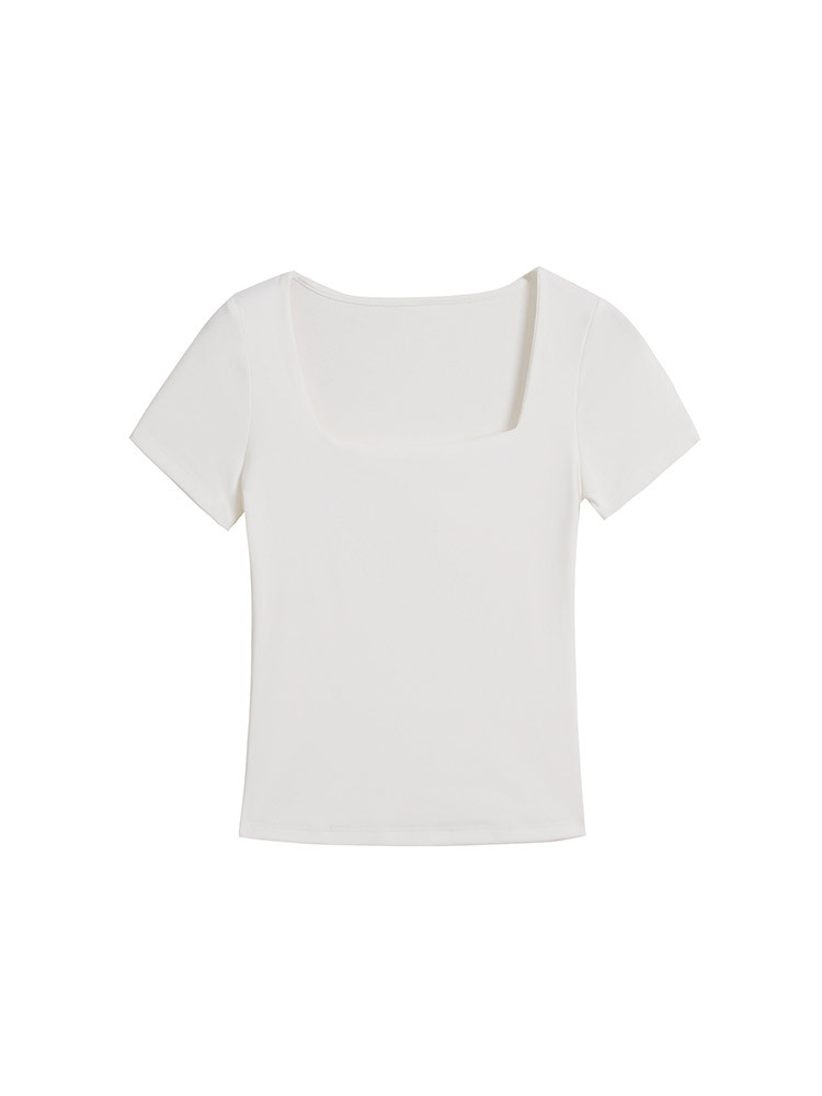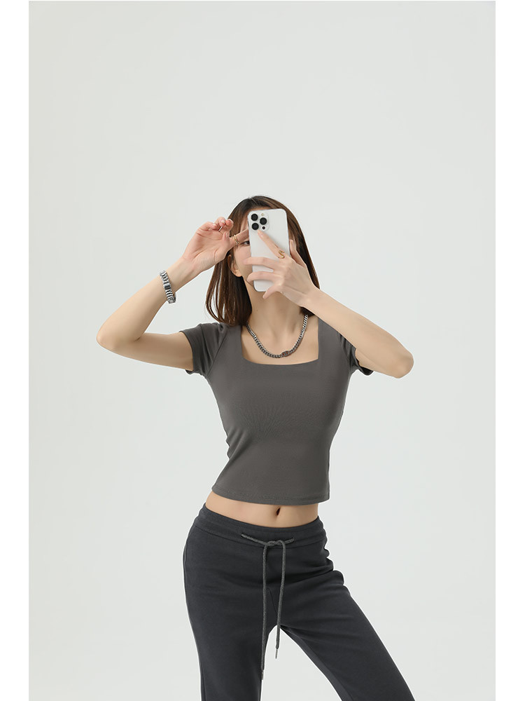 咖色方领正肩锁骨短袖t恤女下摆打底衫春夏新款纯欲修身上衣