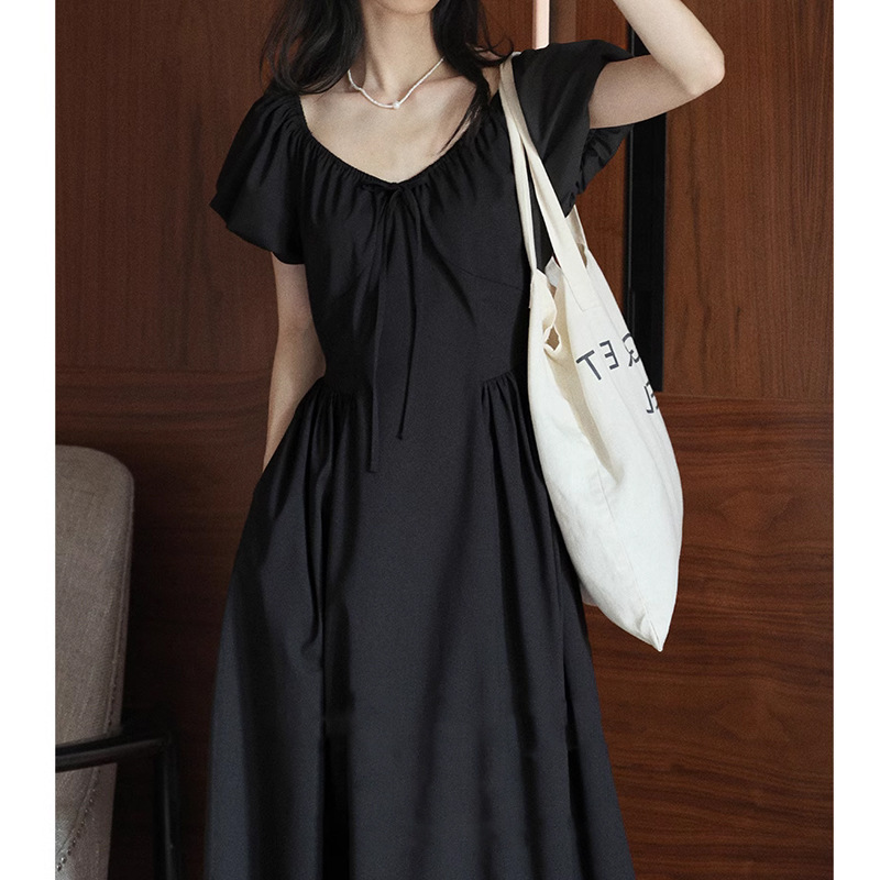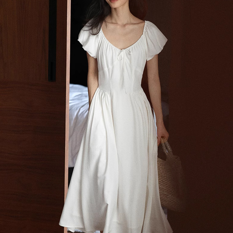 法式复古V领系带连衣裙女夏季新款小众设计显瘦茶歇仙女裙子