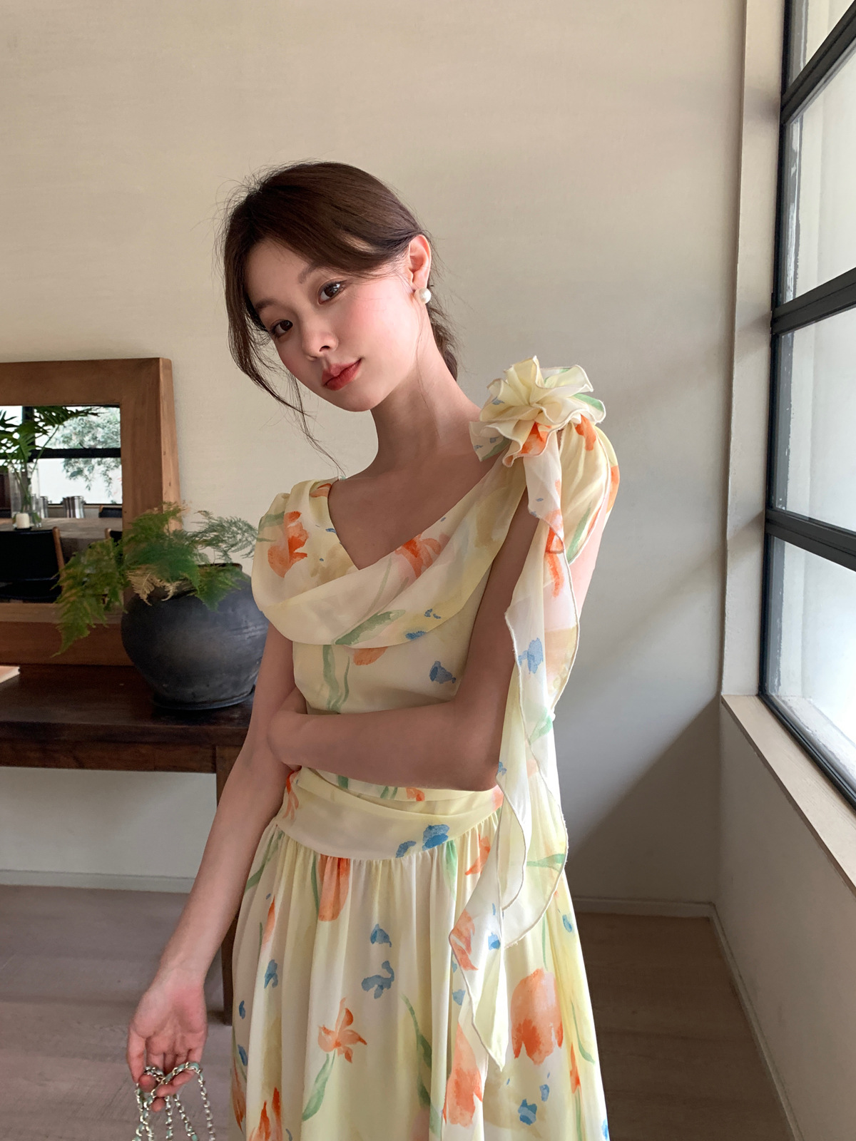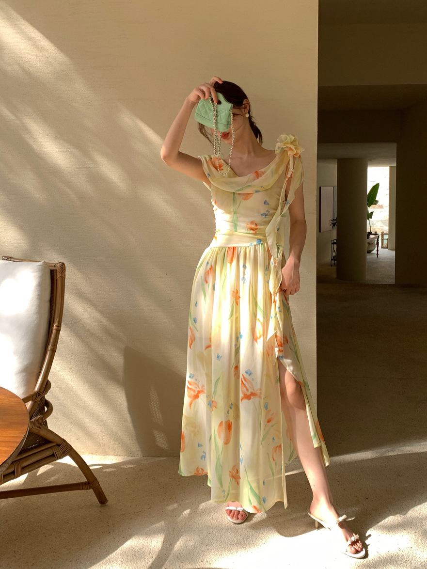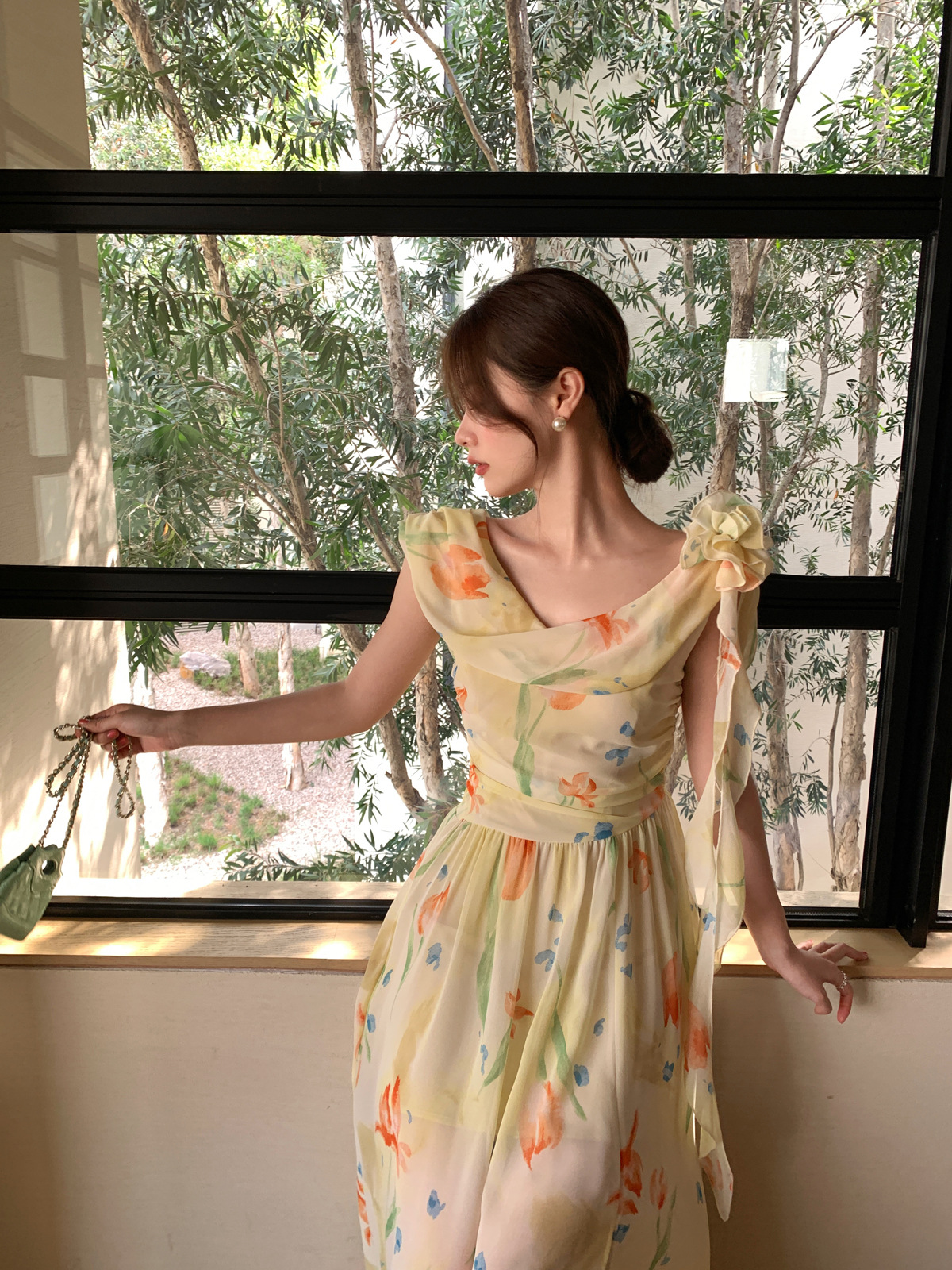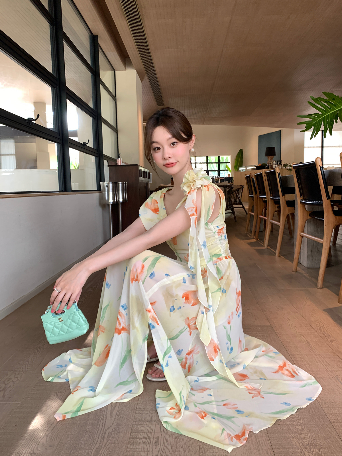 夏季法式田园纯欲气质收腰碎花连衣裙女