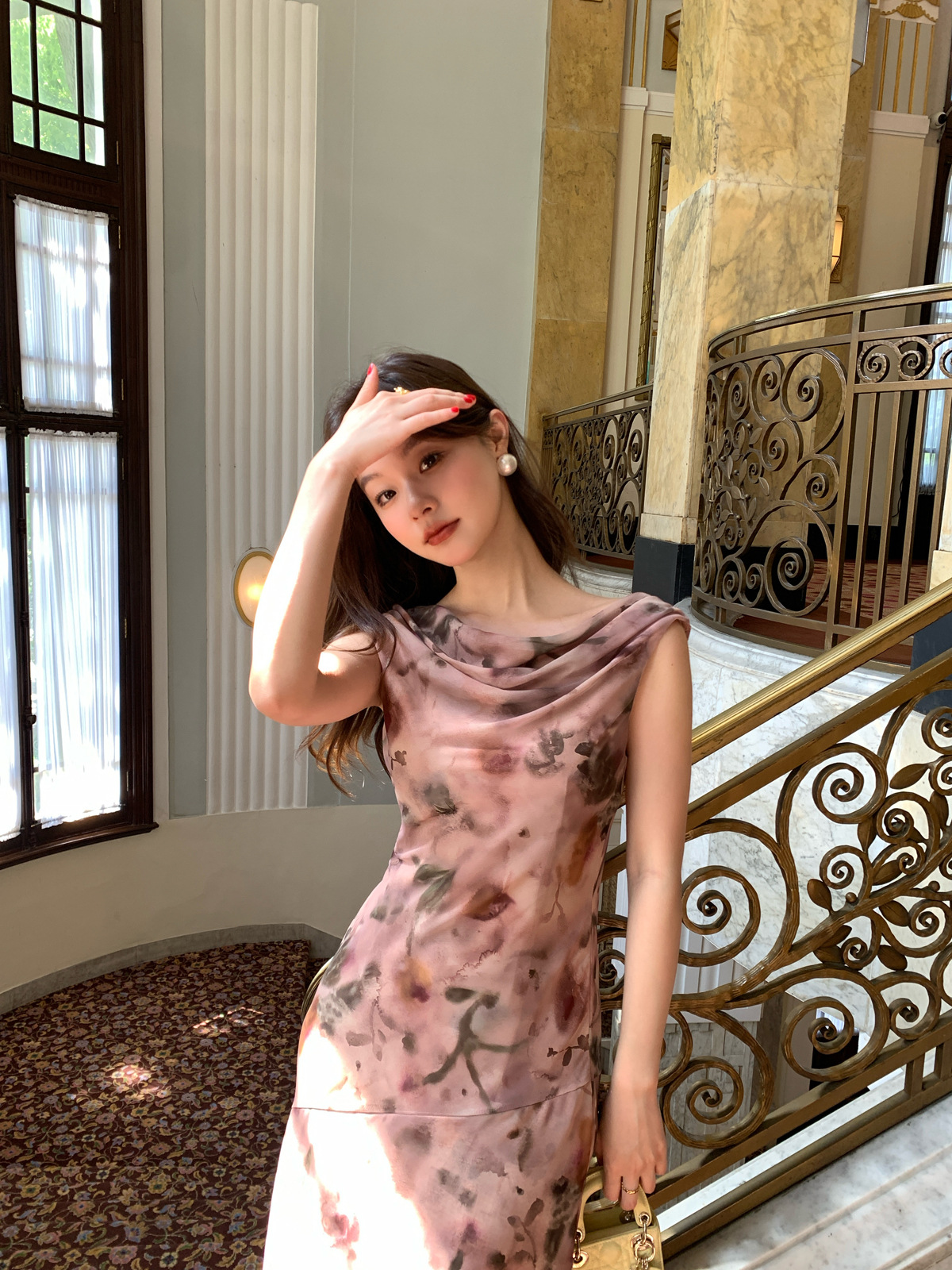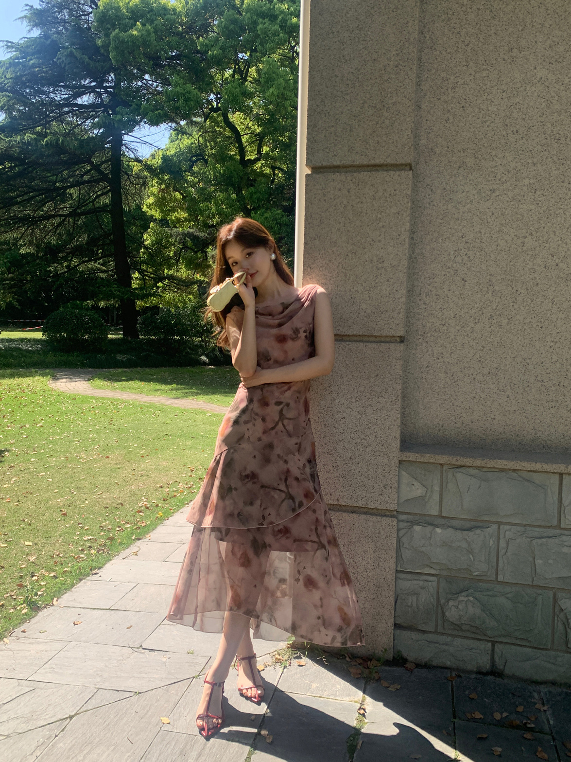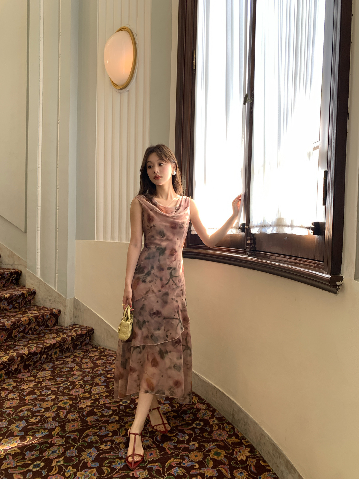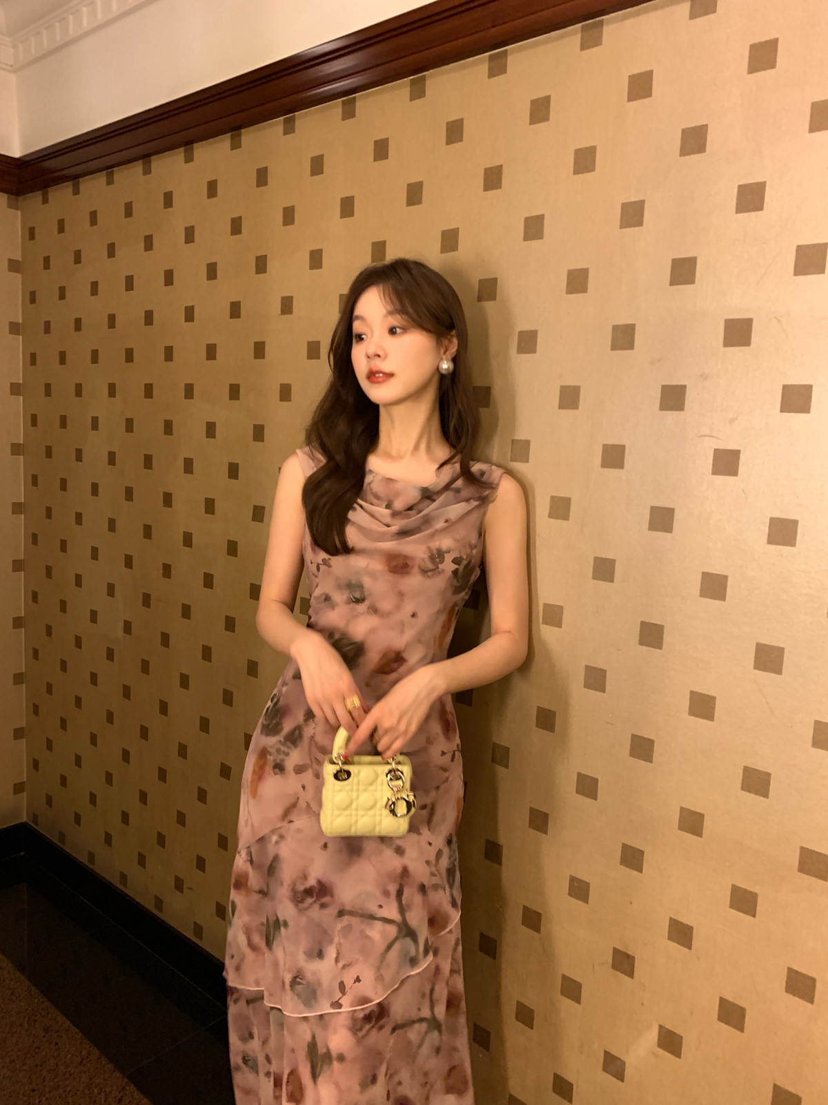 夏季法式茶歇绝美收腰一字肩碎花连衣裙女