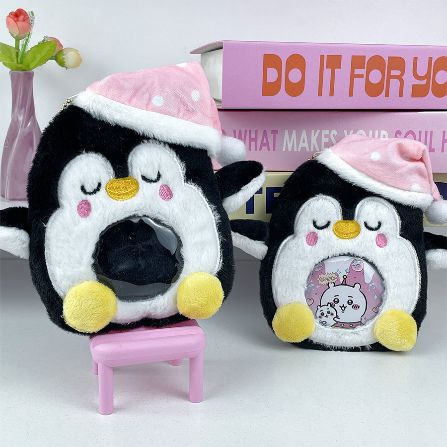 韩版睡帽企鹅毛绒卡套圆形卡包儿童礼物企鹅玩偶网红公仔挂件