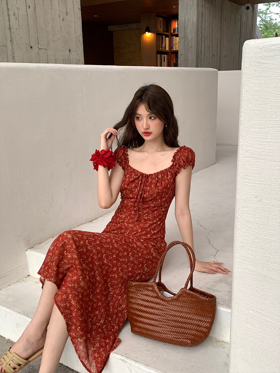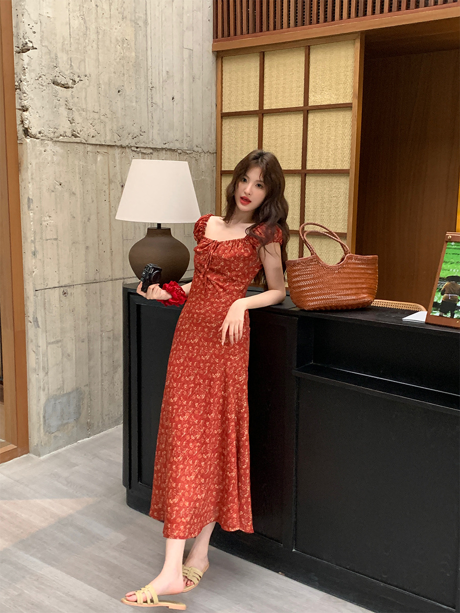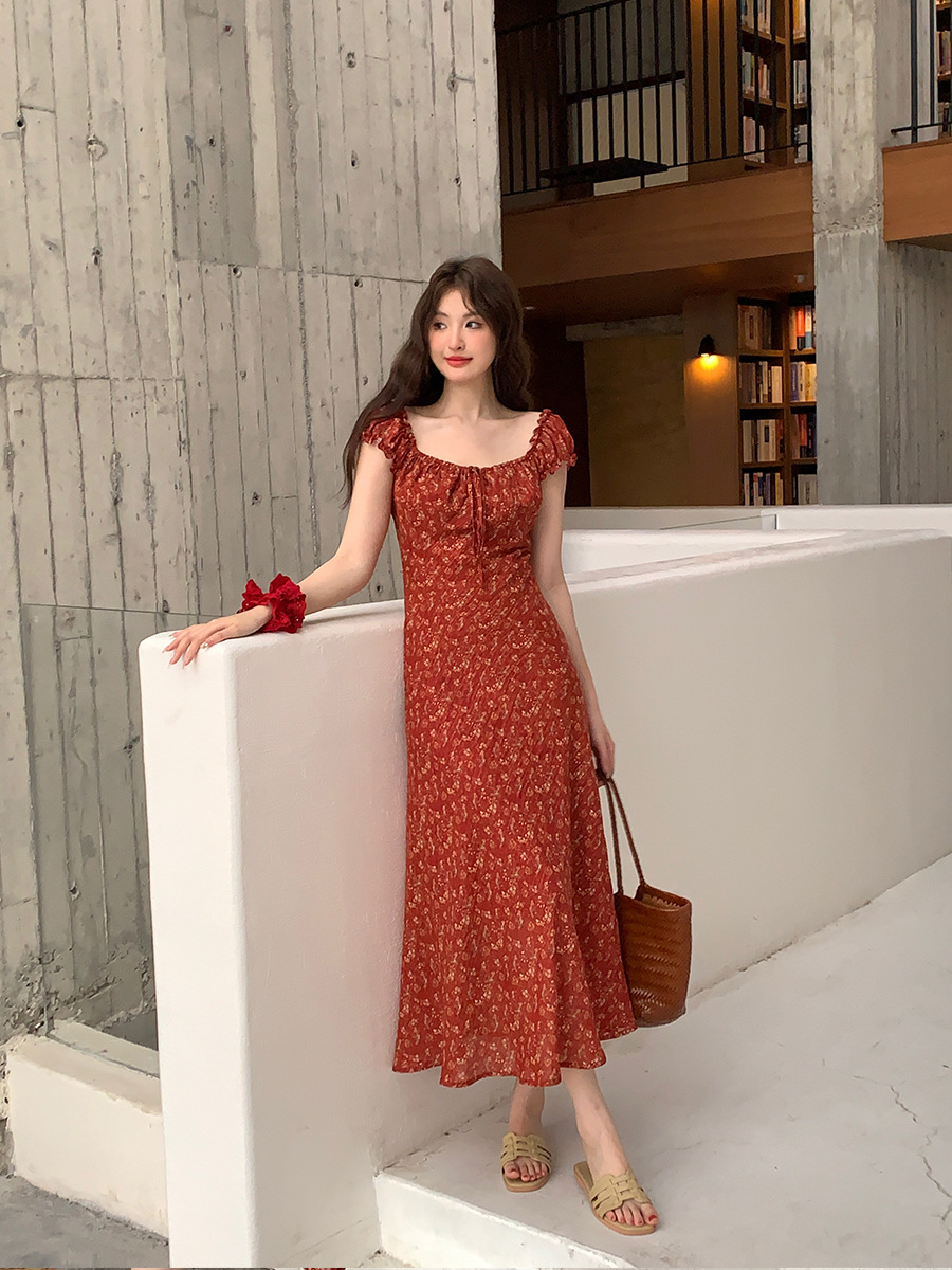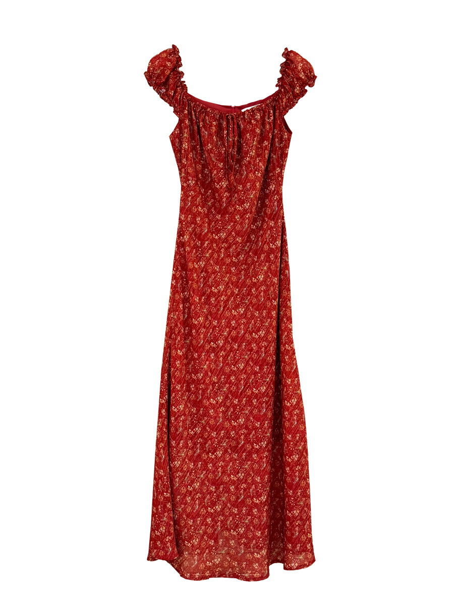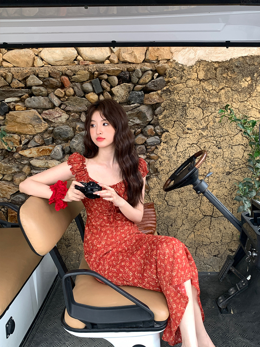 夏季新款气质印花复古高腰无袖吊带连衣裙