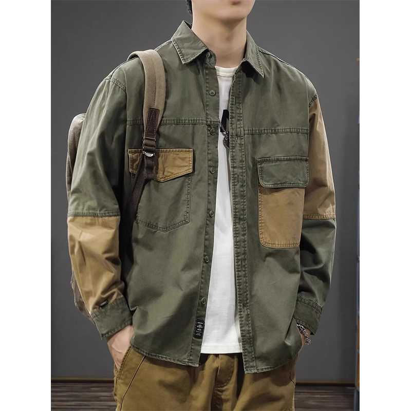 大码美式工装重磅长袖衬衫男春秋设计感拼接衬衣宽松硬汉夹克外套