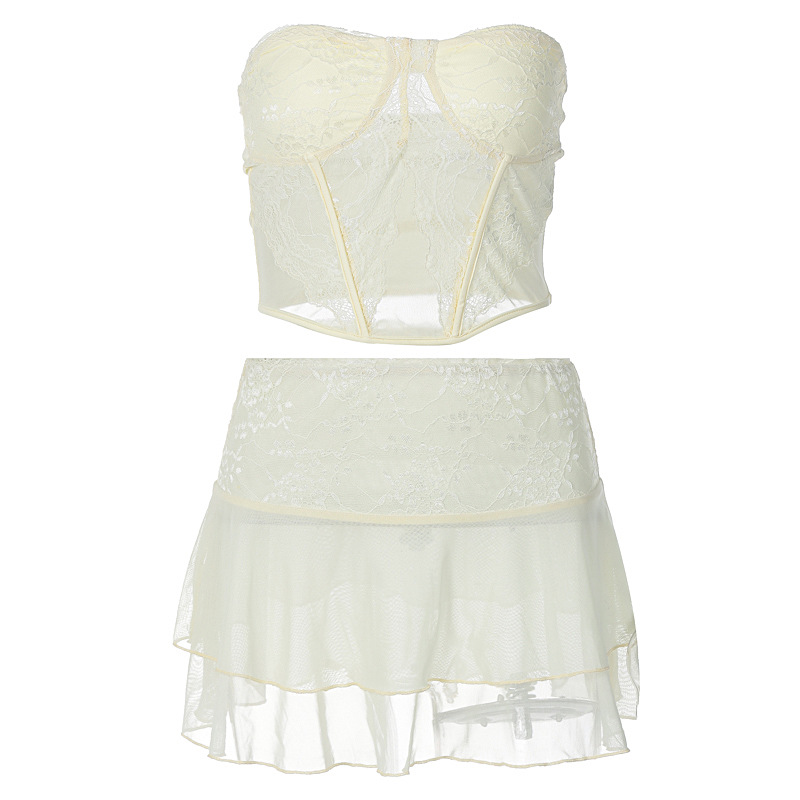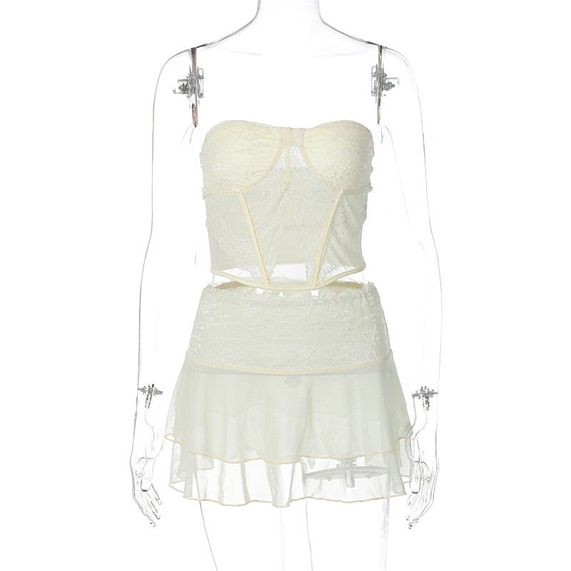 欧美爆品新款女装性感拼贴蕾丝透视裹胸超短双层纯欲风短裙套装女
