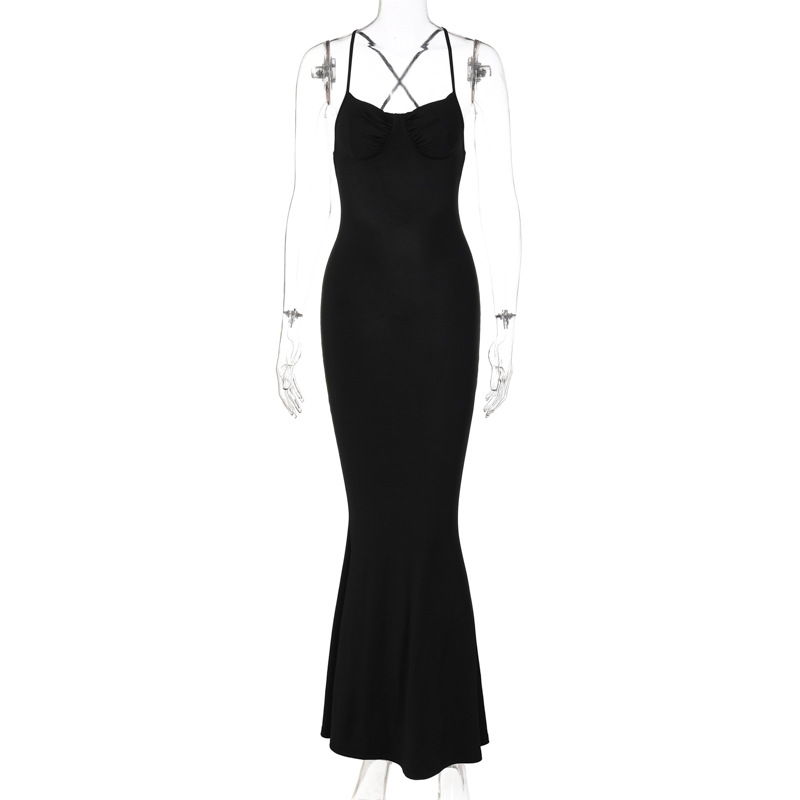 欧美春季爆品新款交叉吊带露背大摆裙连衣裙