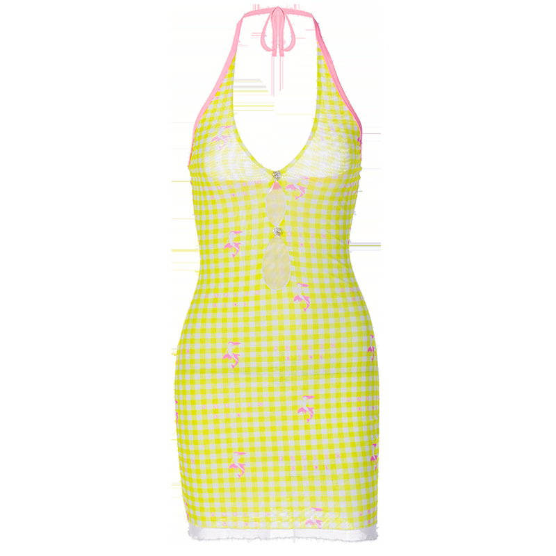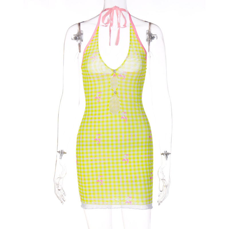欧美风春季新款系带挂脖露背时尚印花包臀连衣裙