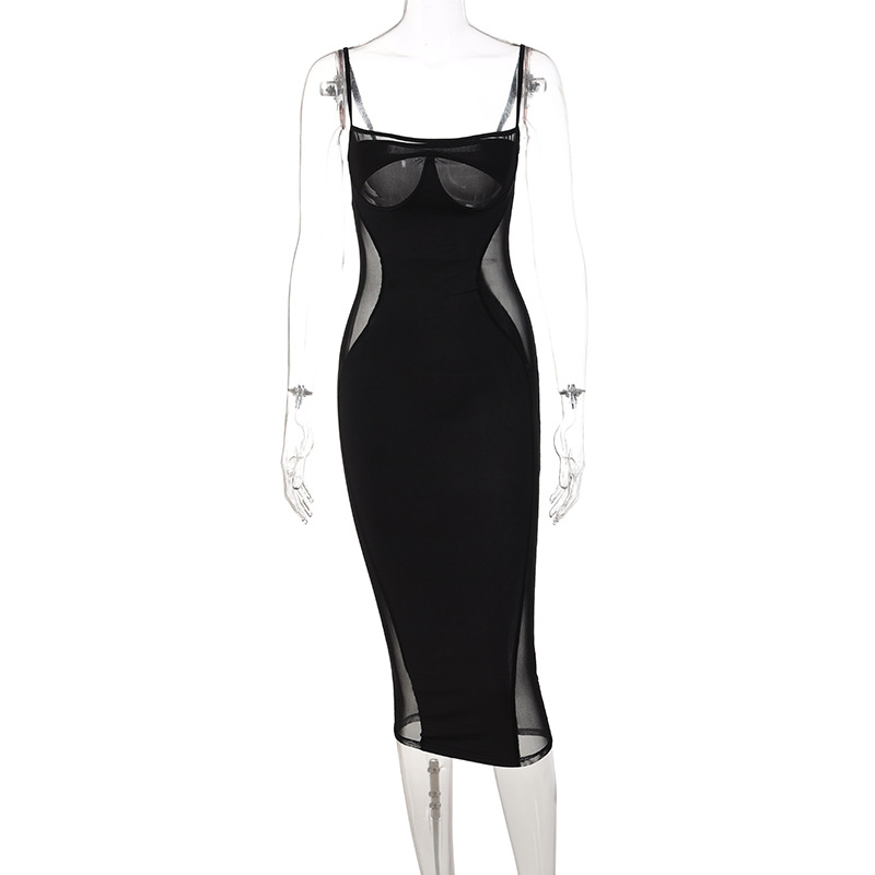 欧美风春季爆品新款网纱拼接纯色胸托修身连衣裙