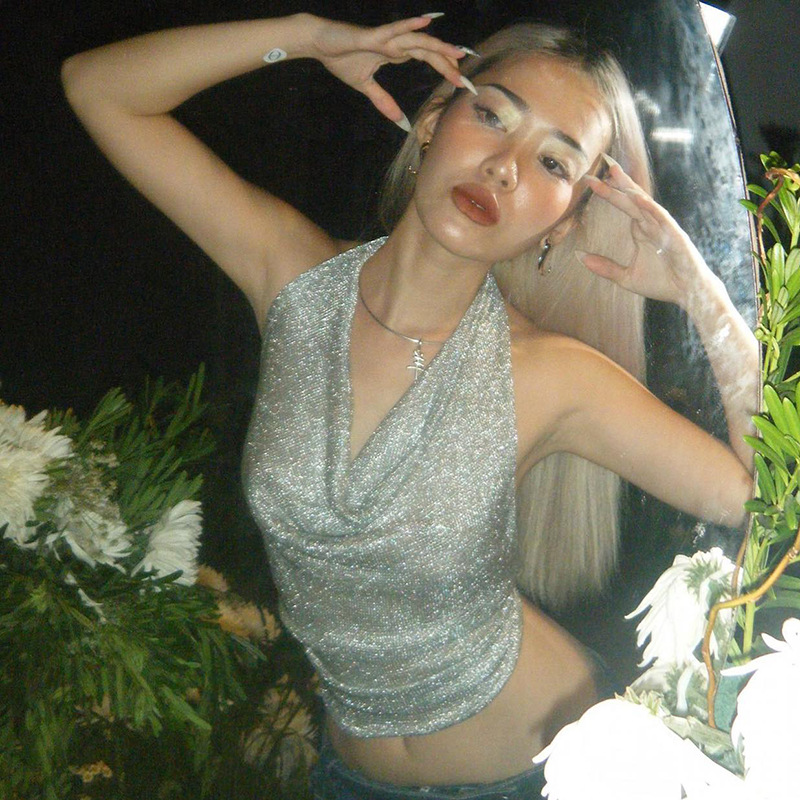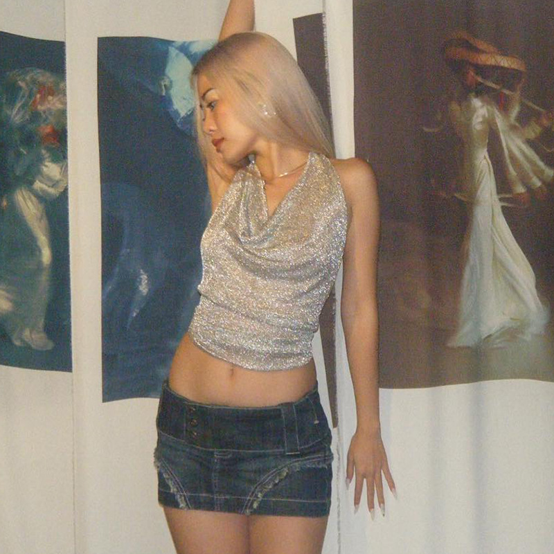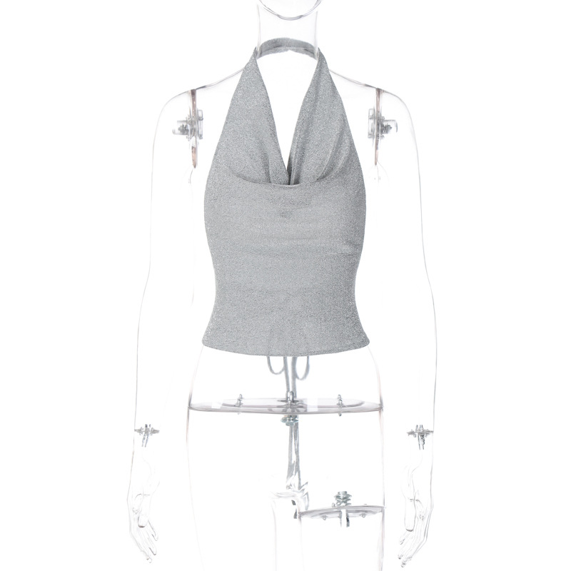 欧美性感夜店风新款女装纯色亮丝反光露背系带绑腰挂脖吊带裹胸女