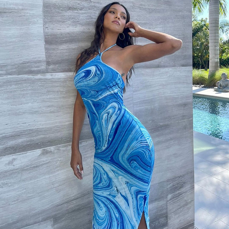 欧美女装新款夏季爆品波西米亚风挂脖吊带性感露背印花连衣裙