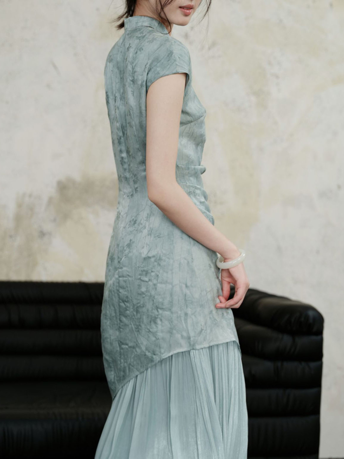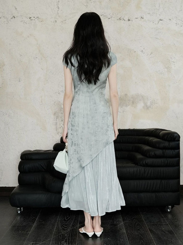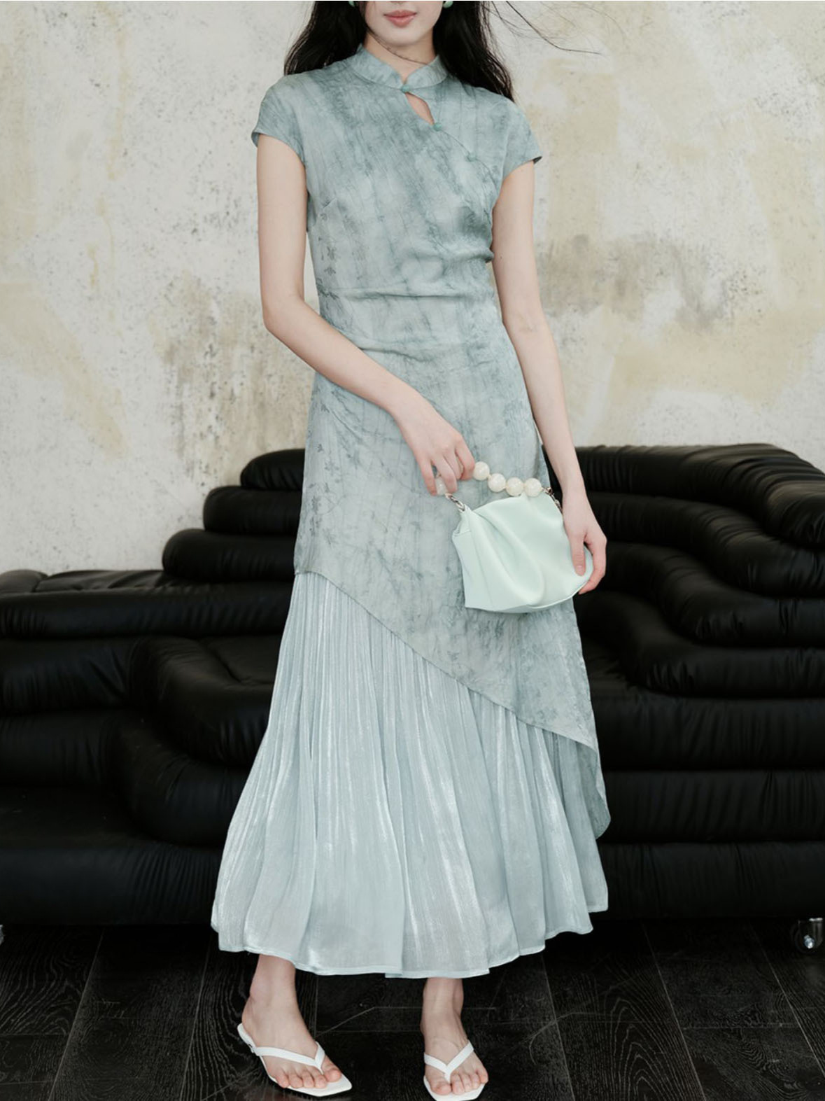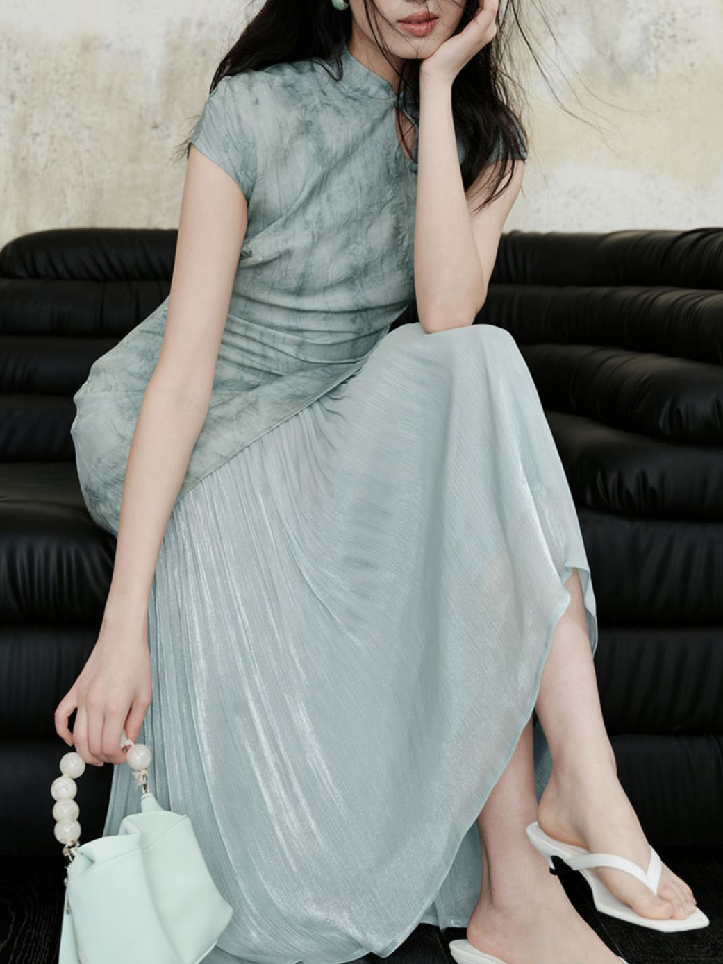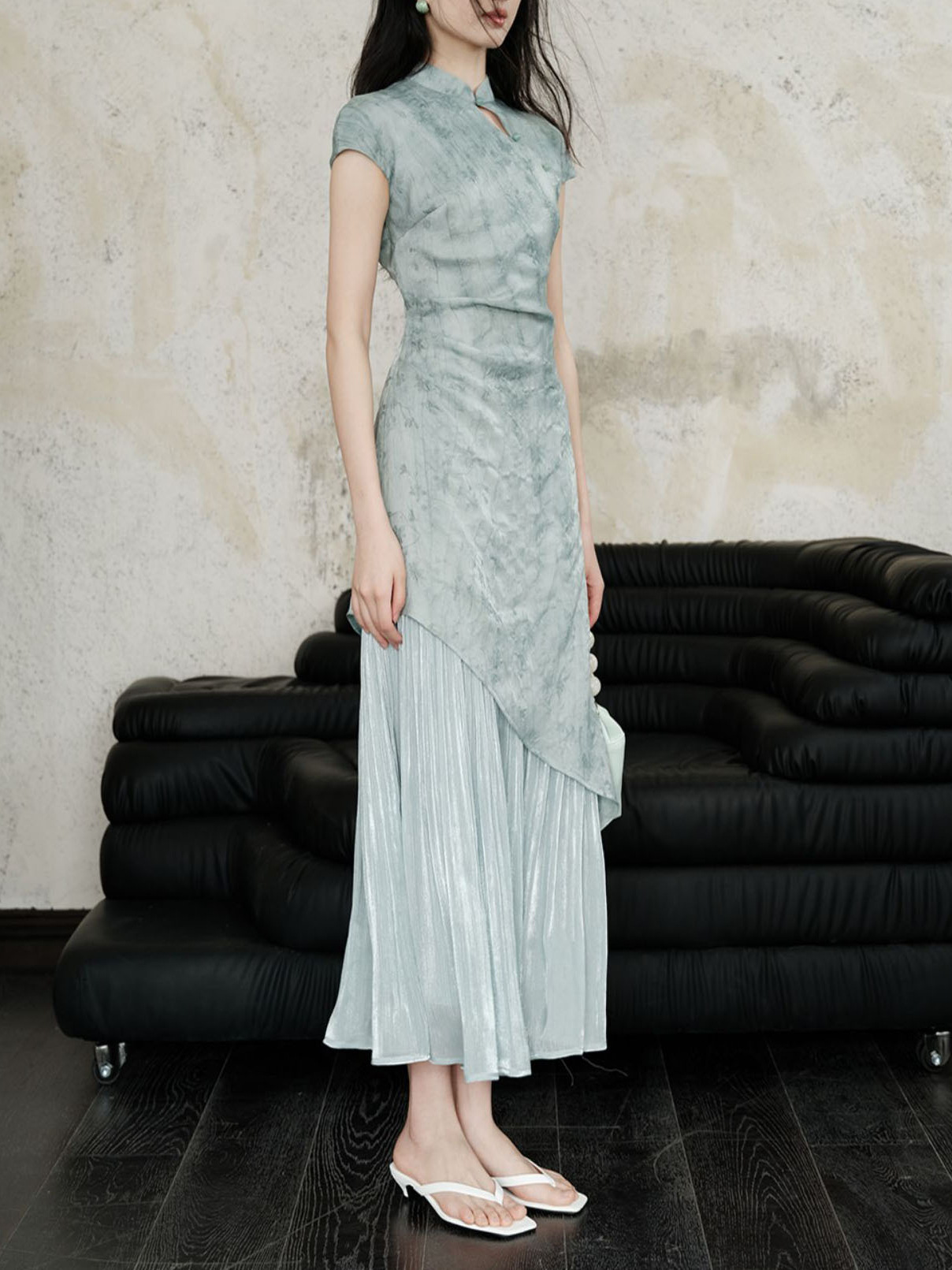 新中式轻国风改良蓝色连衣裙女夏新款气质修身包臀温柔风长裙