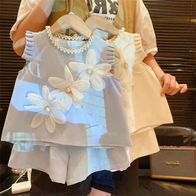 2025夏季新款洋气女童圆领小飞袖上衣短裤两件套宝宝立体花朵套装