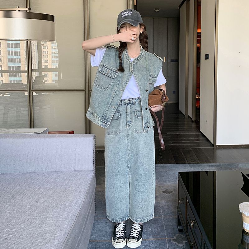 复古做旧牛仔时尚套装女夏新款时髦炸街马甲开叉半身裙两件套