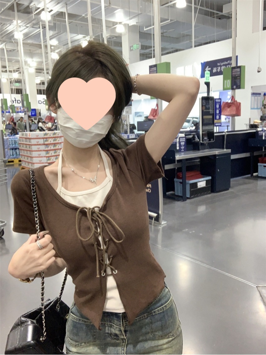 甜辣修身显瘦短款上衣夏季新款女装小众假两件拼接挂脖短袖T恤衫