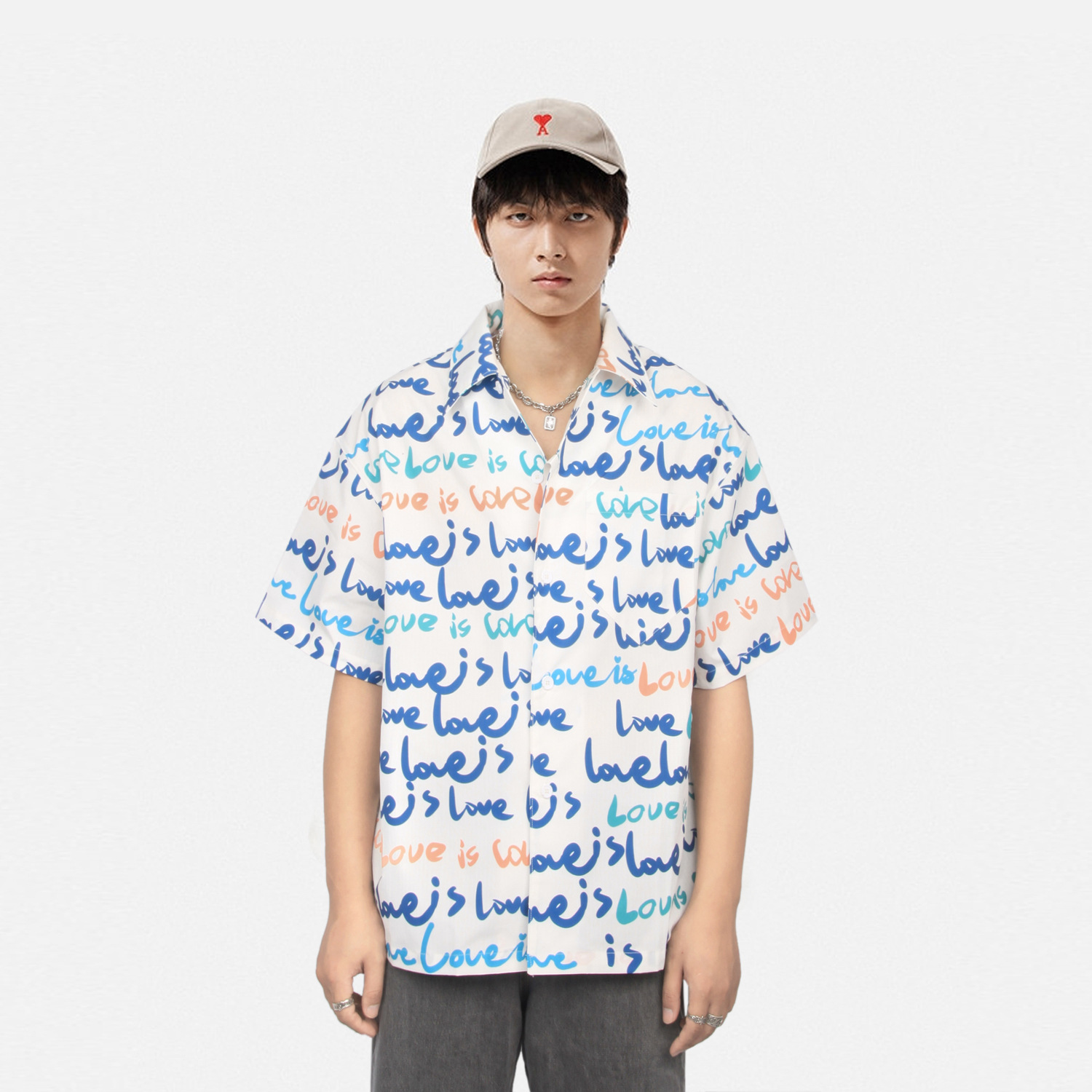 度假休闲廓形短袖衬衫男春夏季新款字母满印宽松休闲百搭上衣
