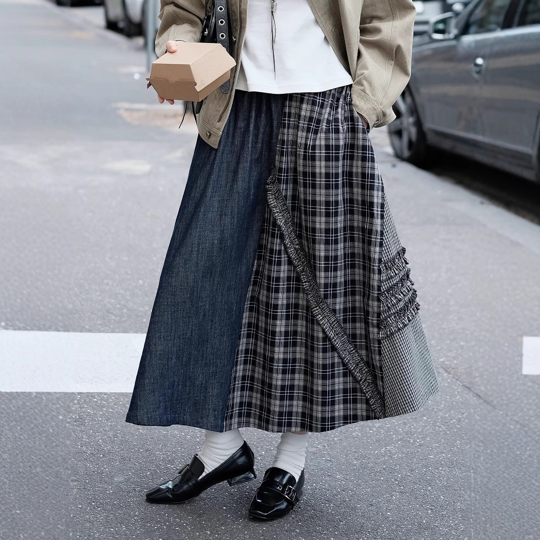 复古A字牛仔插片拼接格纹木耳边松紧腰显瘦半裙
