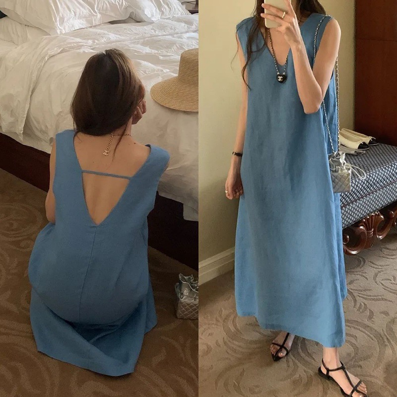 设计感露背v领无袖连衣裙胖MM大码300斤夏季宽松遮肚显瘦背心裙