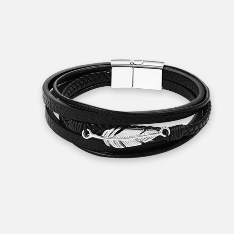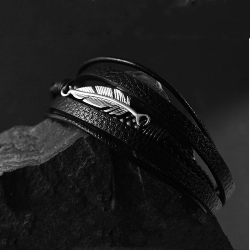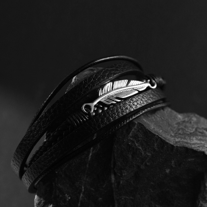 手链男款高级感钛钢羽毛手工编织皮绳手环新款潮流男生手饰