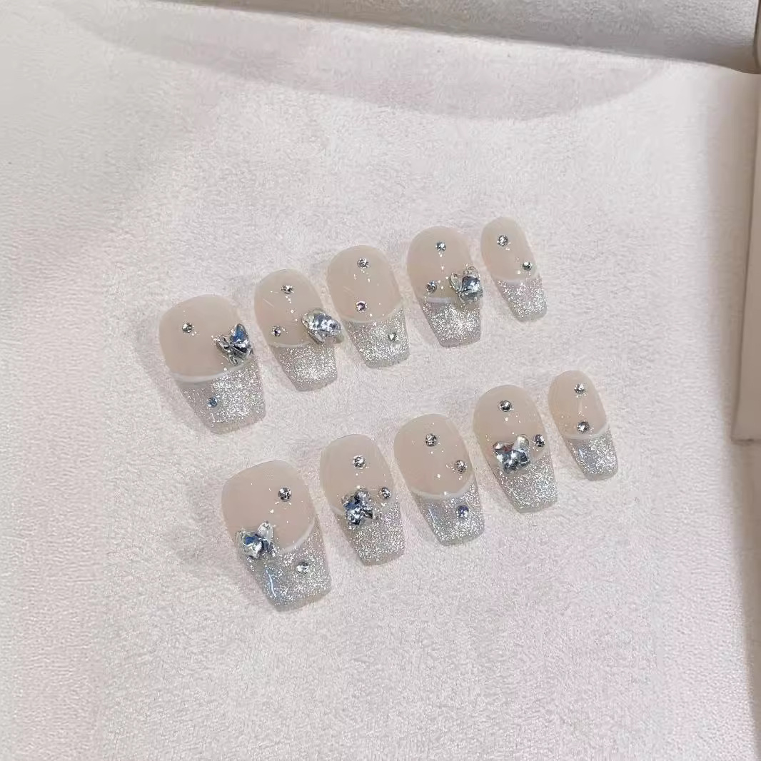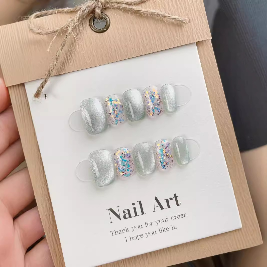 新款爆闪晶石猫眼纯手工穿戴甲高级感小众显白亮晶晶亮片假指甲片