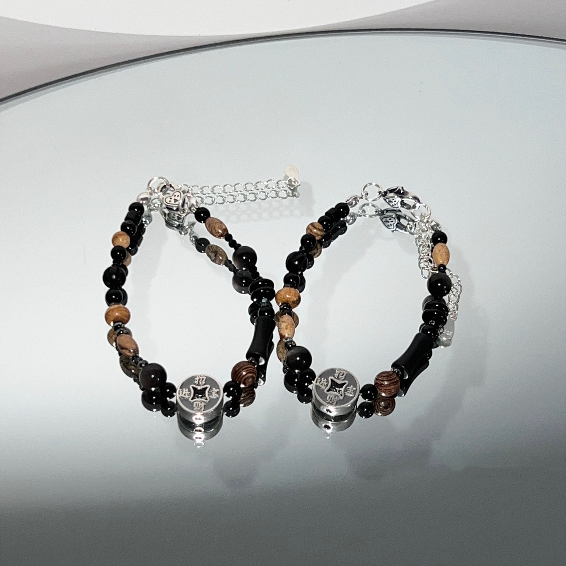 「招财进宝」镀银925黑曜石原创手链新中式情侣七夕礼物