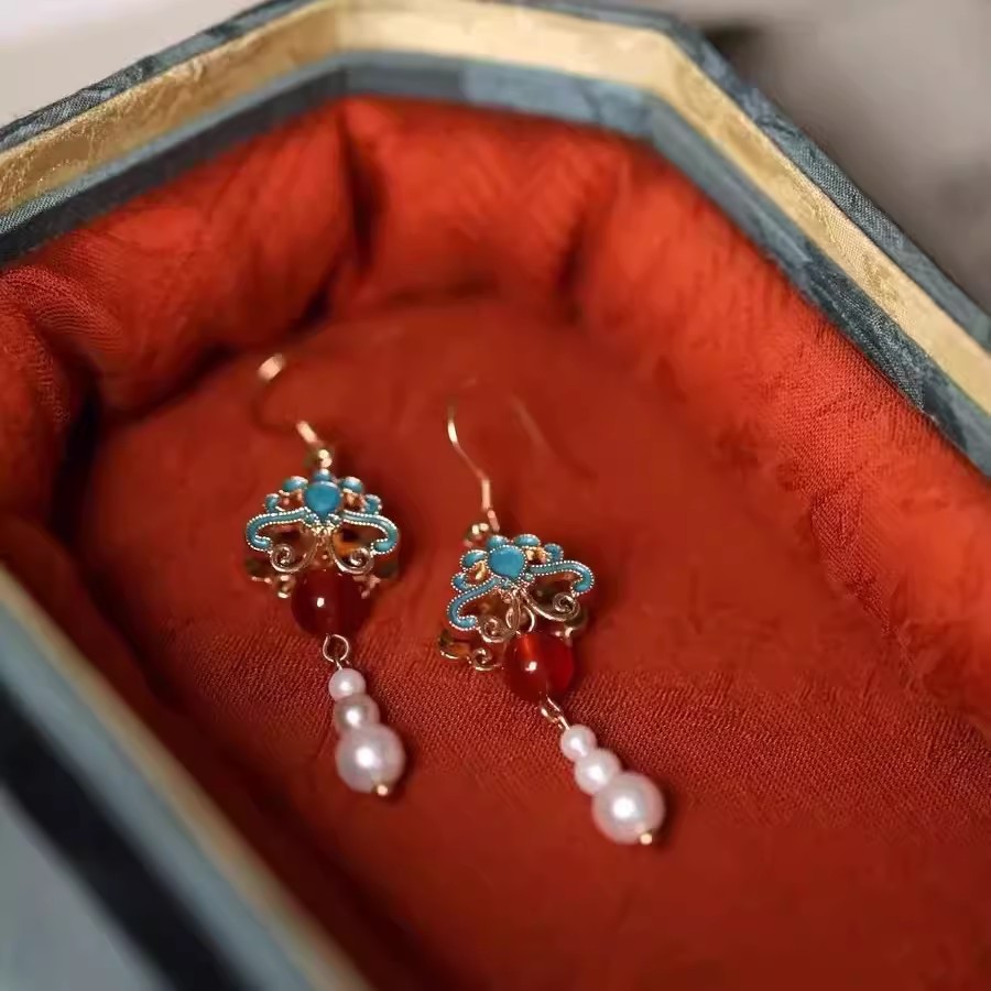 独特珍珠长款耳环新款古风烧蓝蝴蝶耳坠中国风旗袍汉服配饰