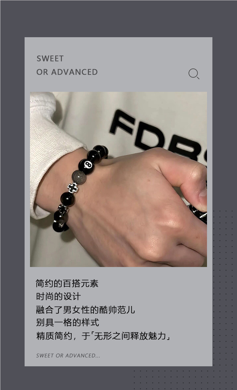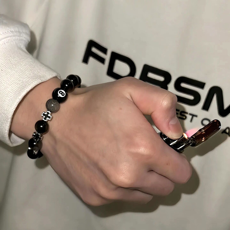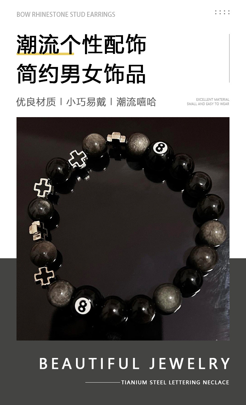 黑曜石手链男潮台球十字架串珠小众百搭简约配饰女高级感轻奢饰品
