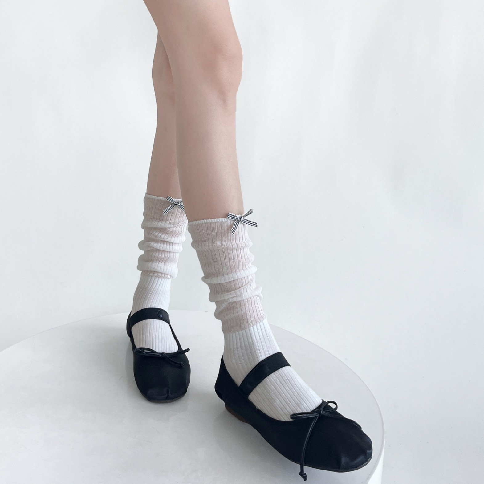 夏季薄透棉纱竖条堆堆显瘦小腿袜女甜美蝴蝶结纯欲中筒袜少女白色