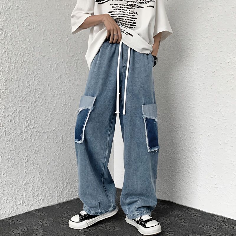贴布破洞牛仔裤男女春秋季复古直筒阔腿裤高街ins潮牌痞帅