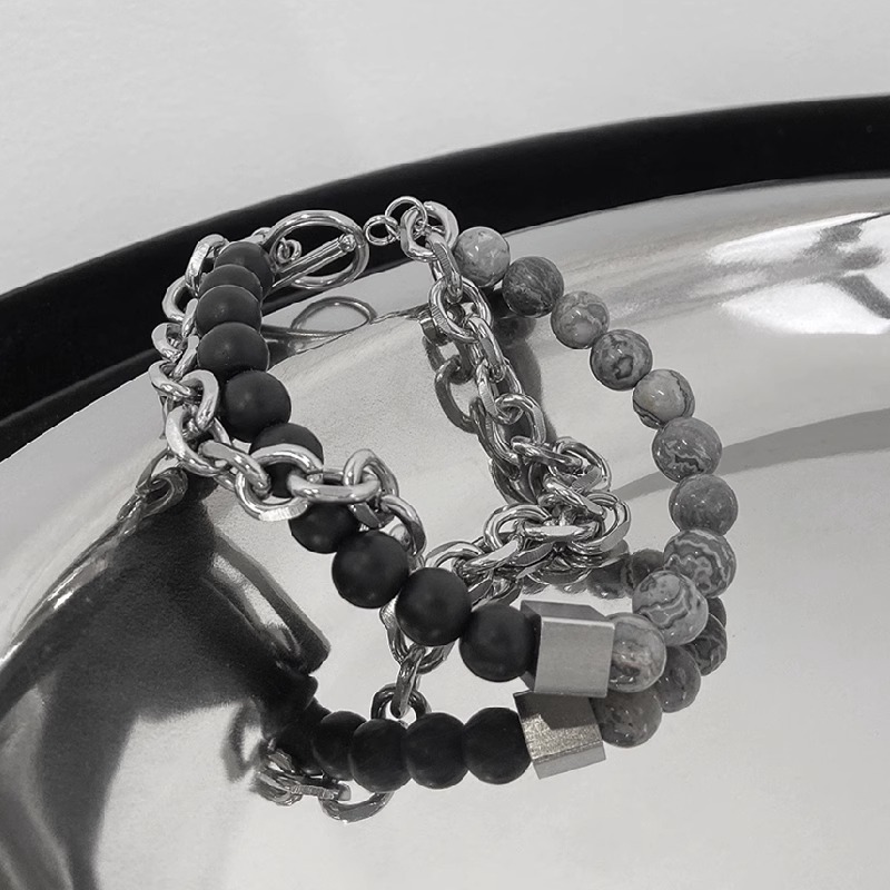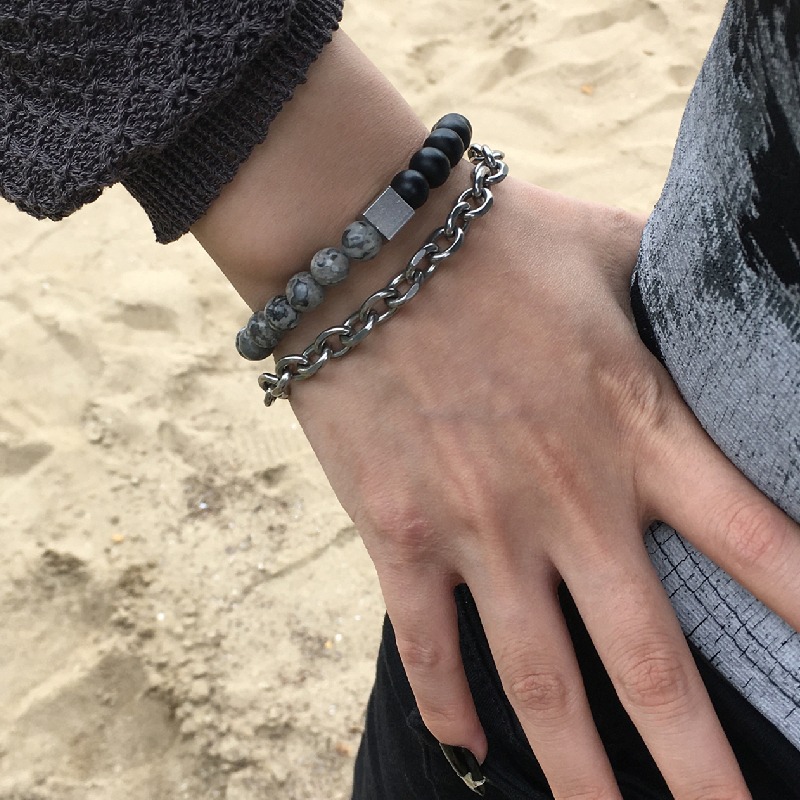 天然石双层手链男百搭小众设计黑曜石手串个性复古配饰高级感饰品