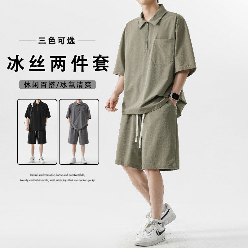 男生夏季冰丝polo衫套装速干半拉链短袖t恤宽松痞帅运动休闲套装