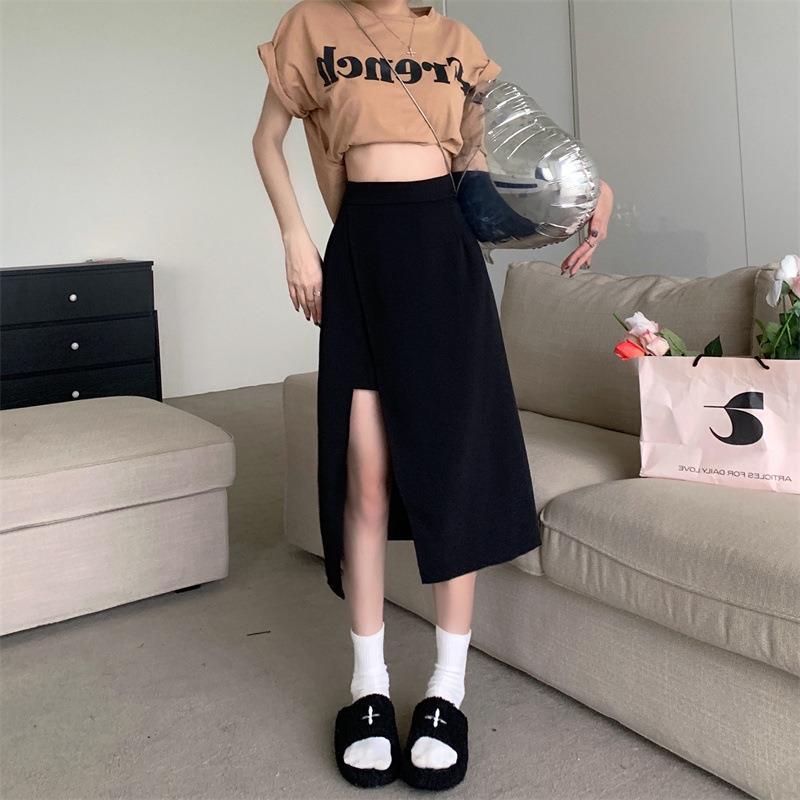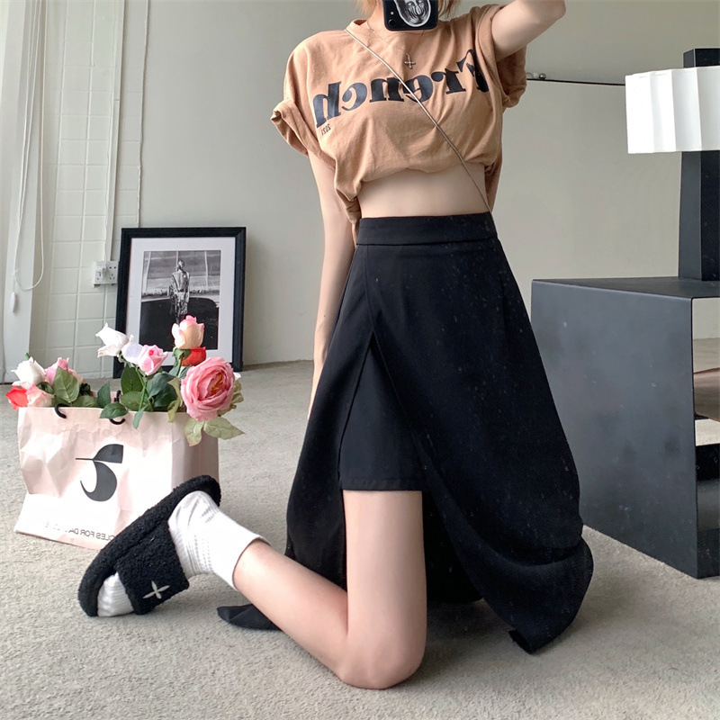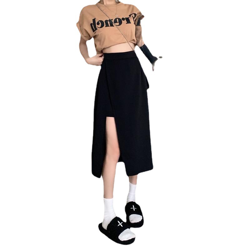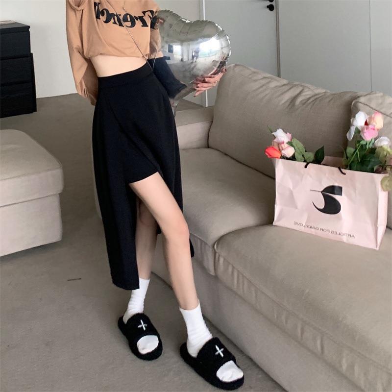 大码胖mm不规则开叉黑色半身裙女夏季中长款A字裙高腰包臀裙裙子