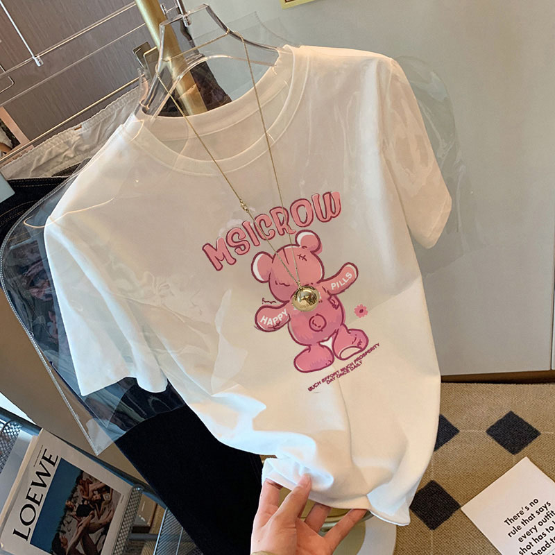 夏季2025新款白色纯棉短袖t恤女宽松百搭粉色熊印花洋气质感上衣