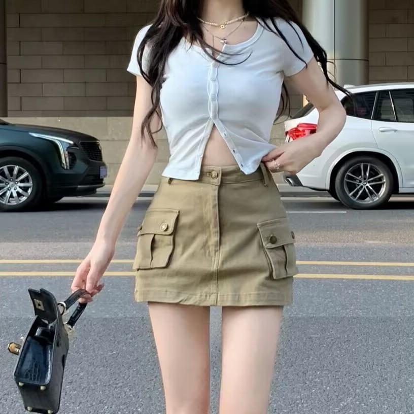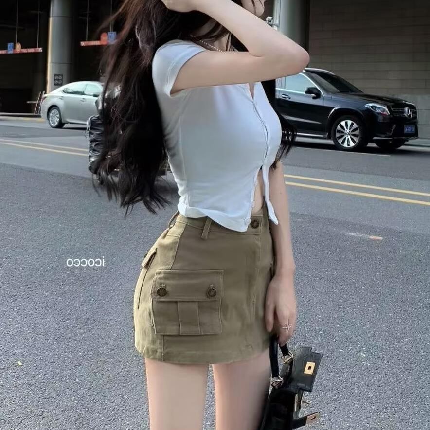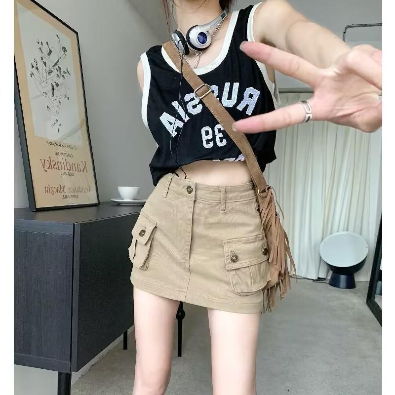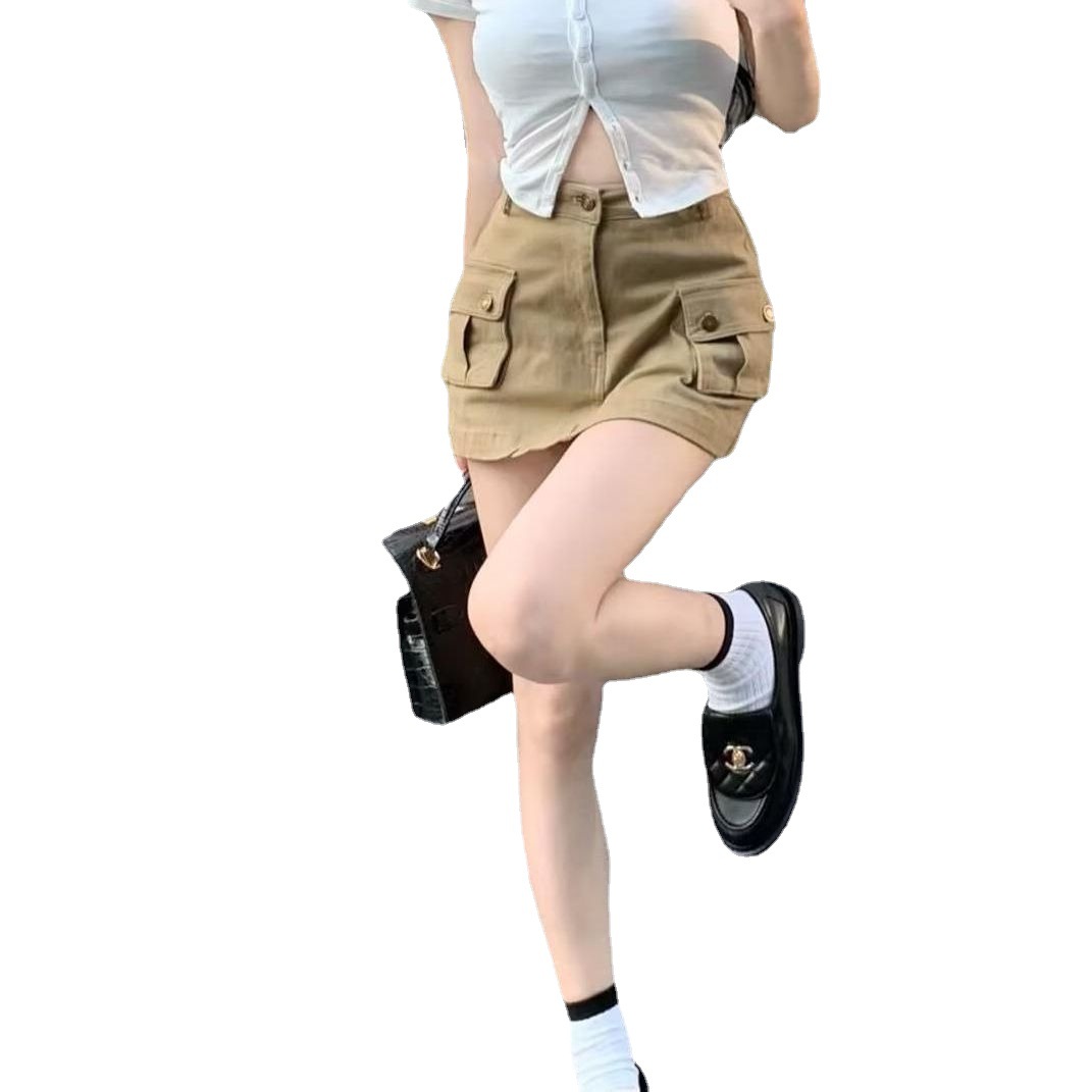 新款辣妹卡其色a字工装半身裙女夏牛仔裙性感包臀裙口袋裙子