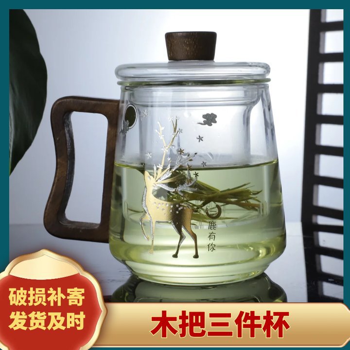 木把玻璃茶水分离泡茶杯个人用办公室茶杯一鹿有你玻璃三件杯