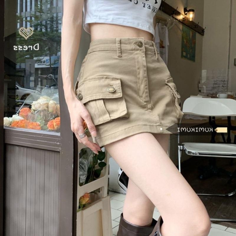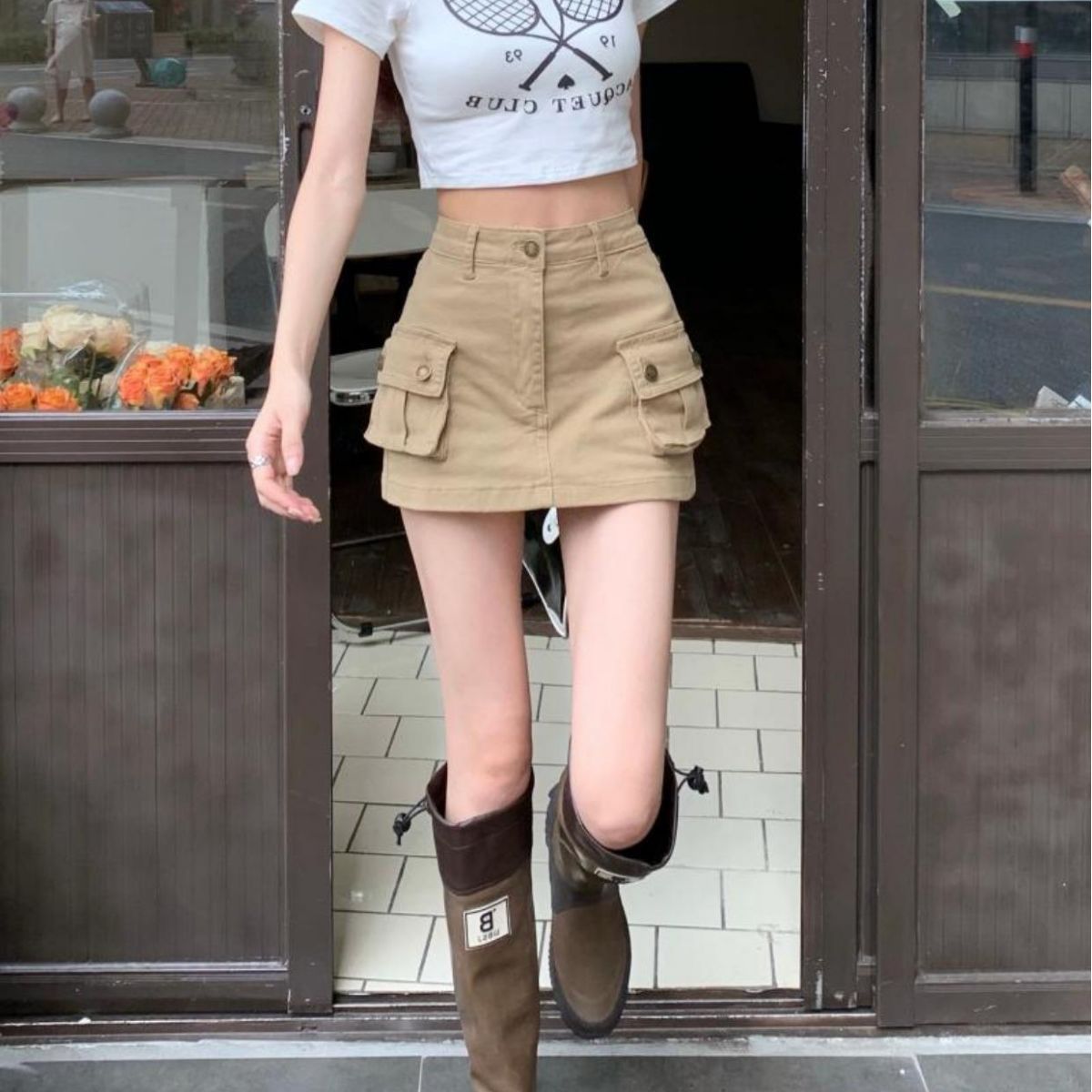 秋季辣妹防走光牛仔卡其色工装裙显瘦美式半身裙高腰A字短裙