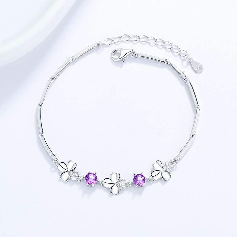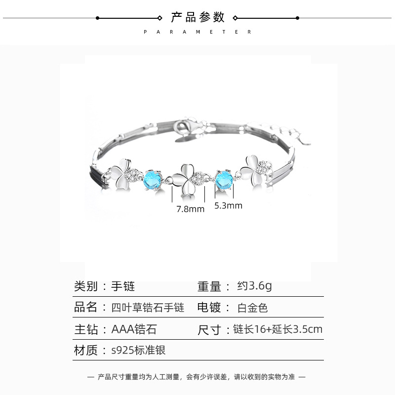 紫水晶四叶草情侣手链女士纯银S925简约时尚蓝水钻首饰韩版饰品