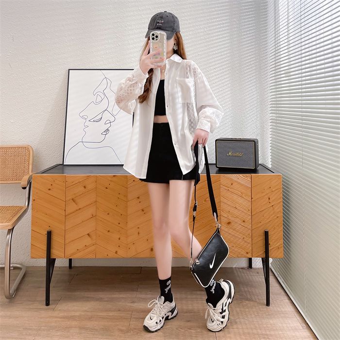 外贸大码女装韩版重工质量中长款开衫蕾丝拼接薄款外套衬衫雪纺衫