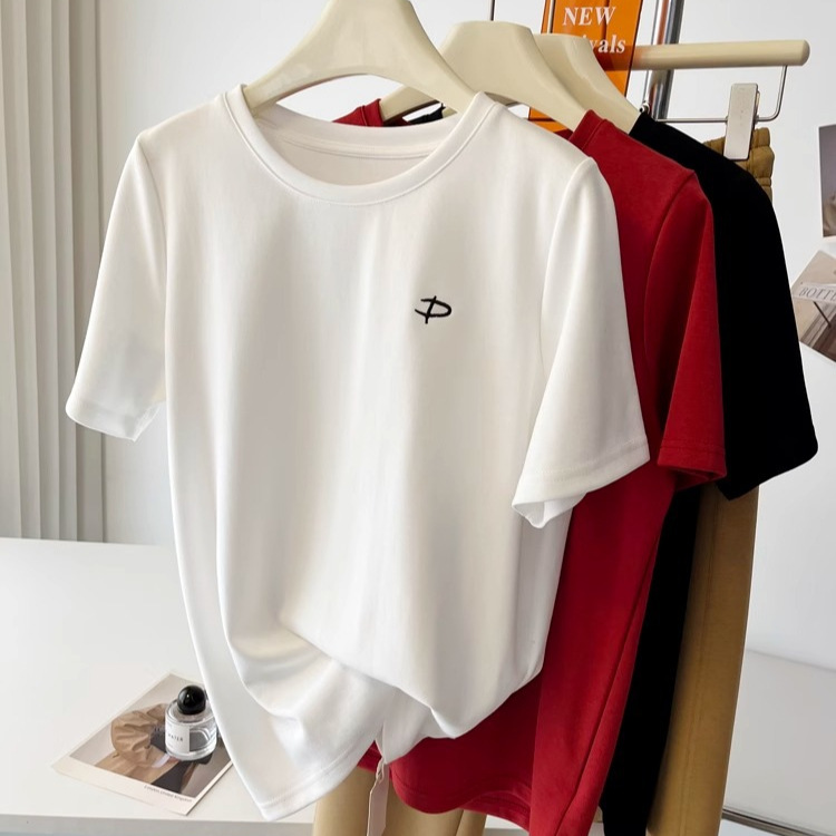 简约小刺绣~正肩短袖t恤女夏季洋气宽松气质休闲百搭打底衫上衣
