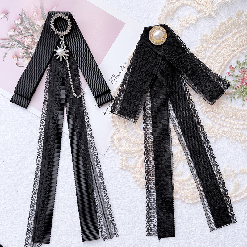 韩国同款黑色蕾丝领结女小香风蝴蝶结水钻装饰领花时尚学院风胸针