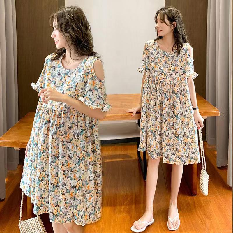 网红孕妇夏装连衣裙时尚款潮妈碎花雪纺裙个性露肩夏天裙子潮