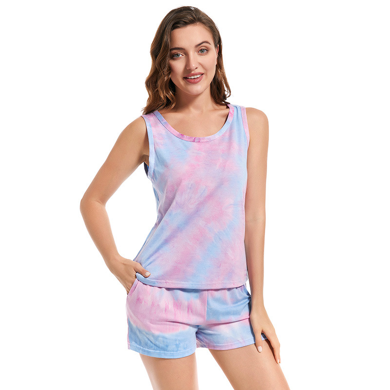 玉胜欧美风潮流扎染针织棉女士家居服吊带背心短裤套装休闲睡衣女