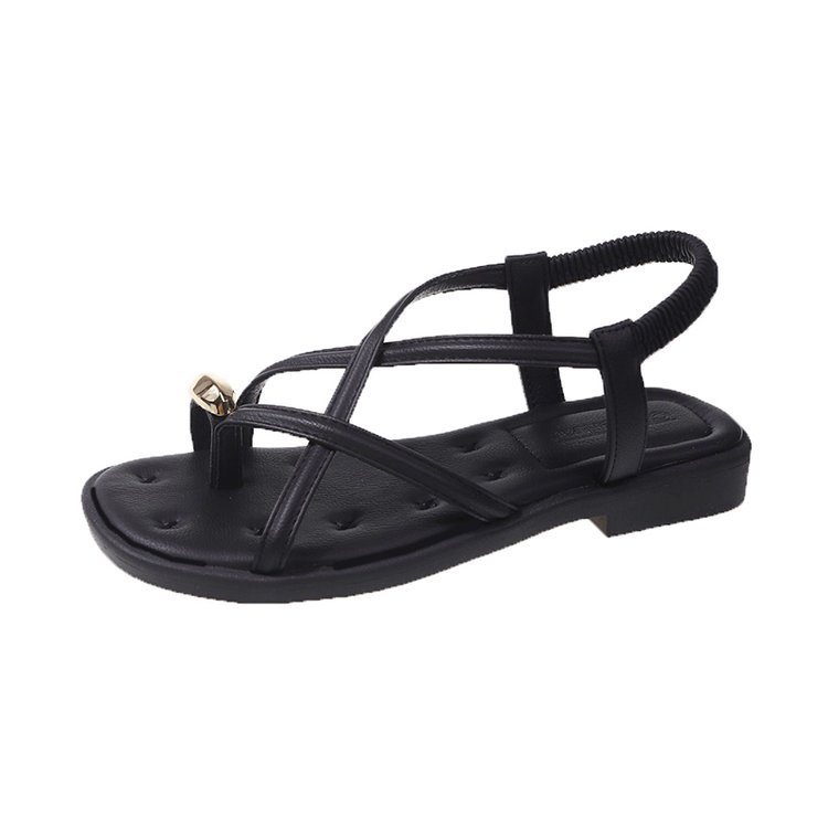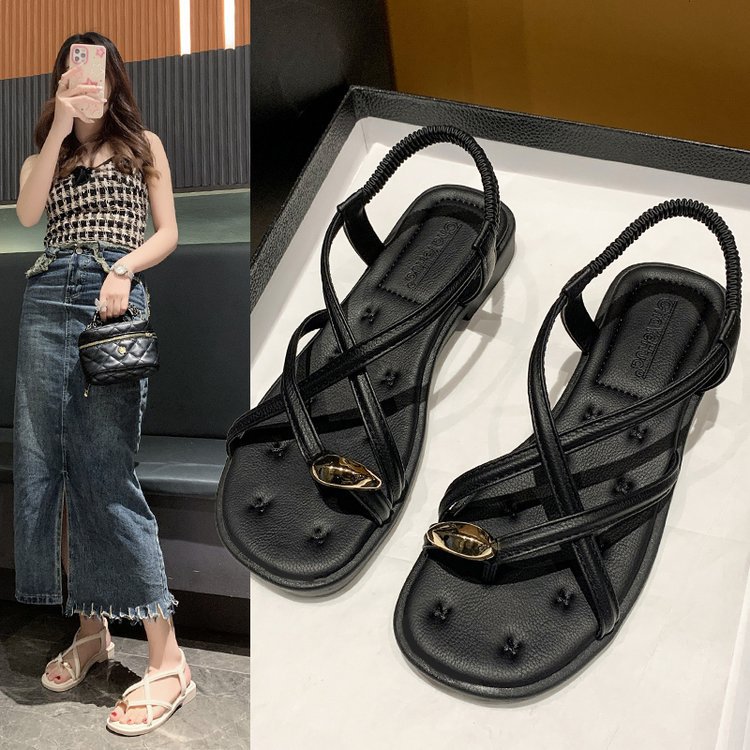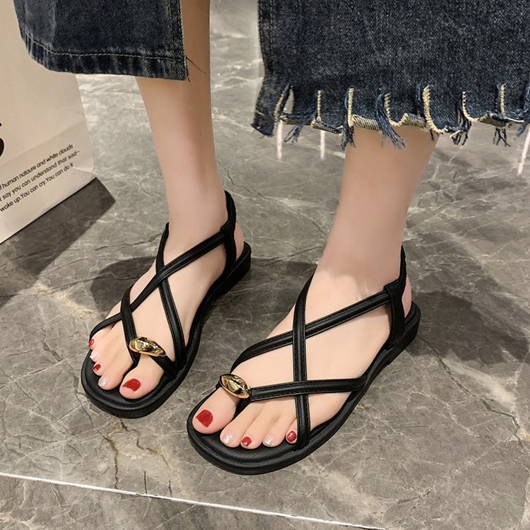 夏季新款韩版平底凉鞋女金属扣套趾交叉松紧套脚时尚女鞋