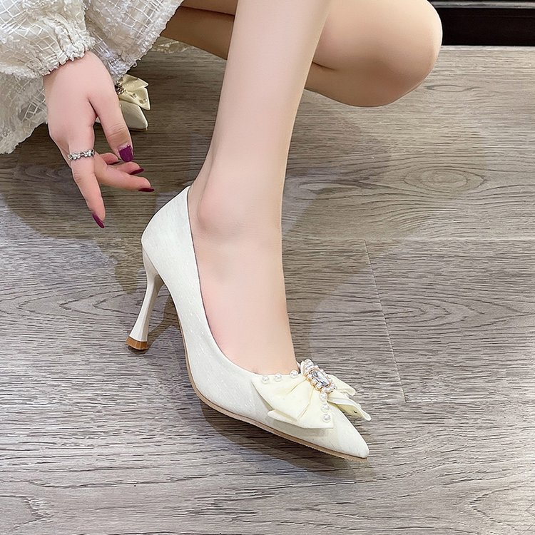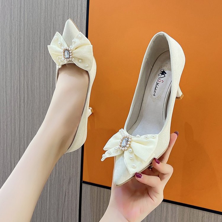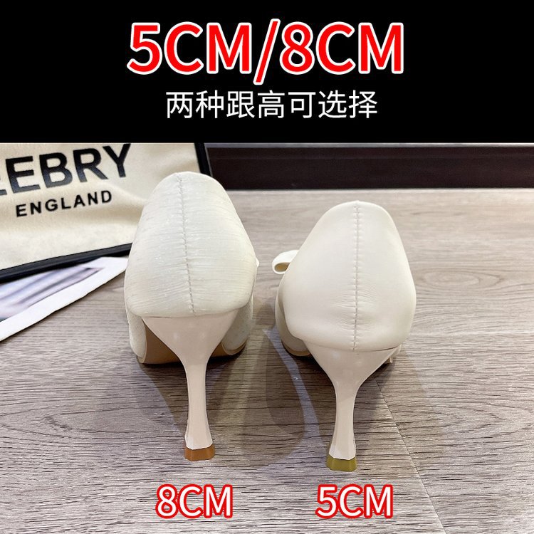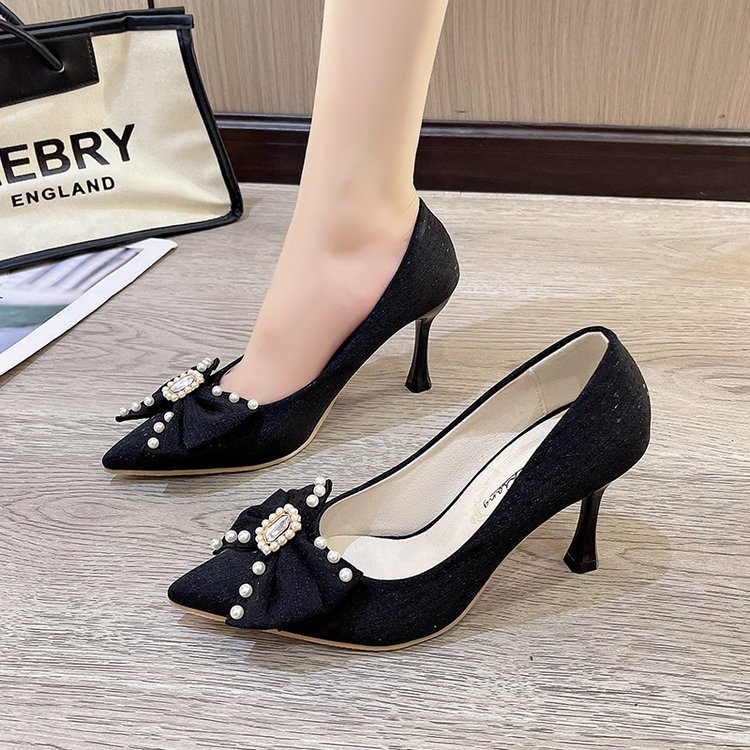 秋季新款蝴蝶结细跟单鞋尖头浅口高跟鞋黑色时装职业女鞋