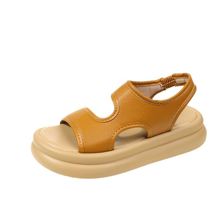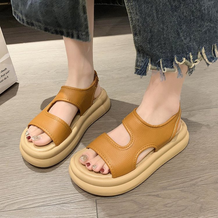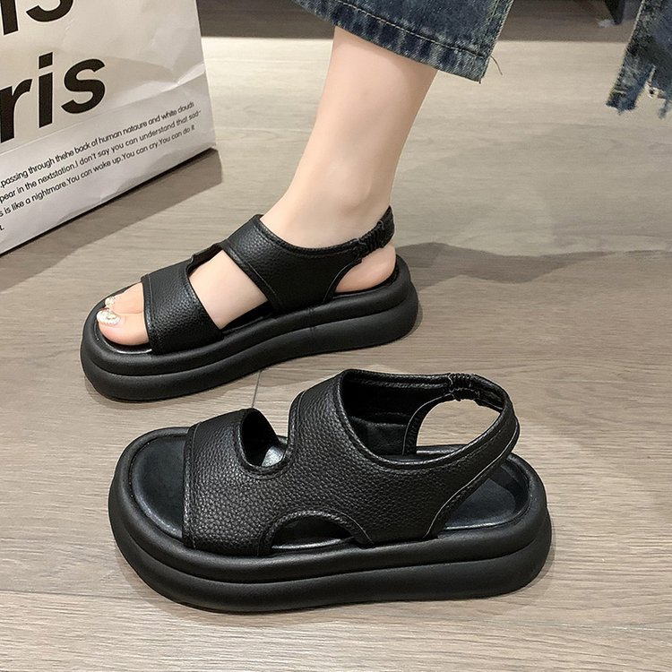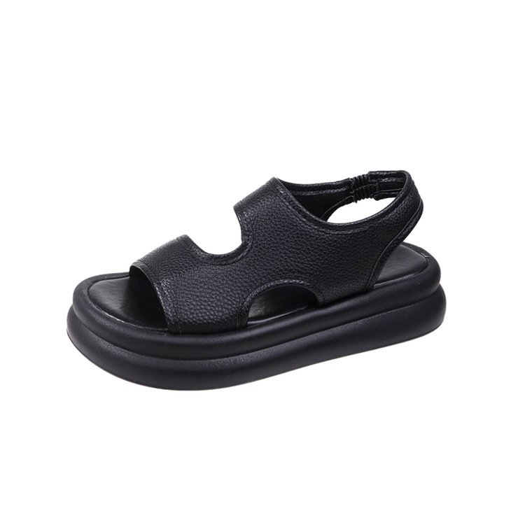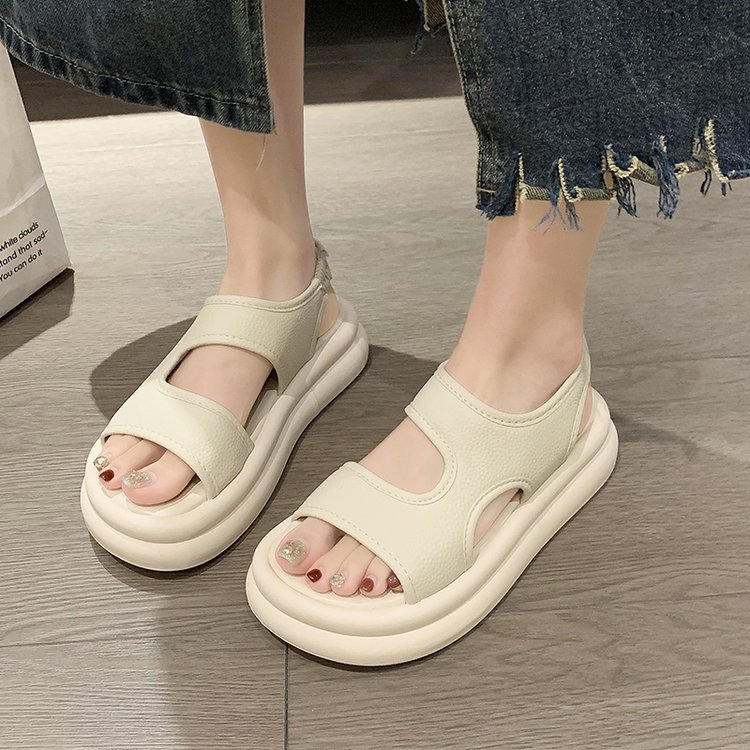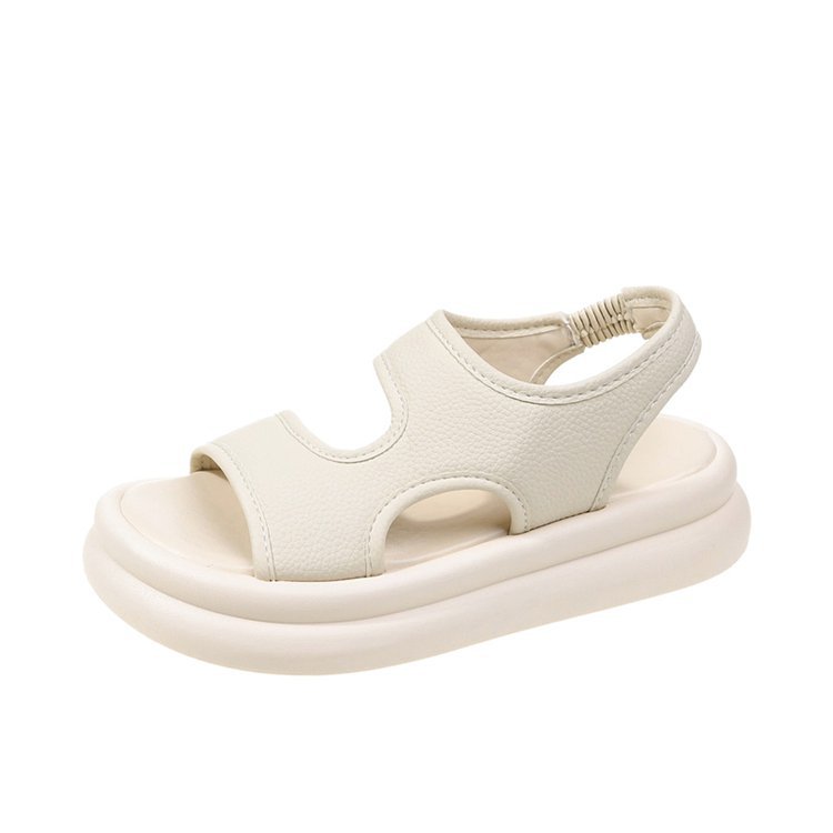 夏季新款厚底凉鞋女松紧带套脚镂空休闲露趾中跟沙滩凉鞋