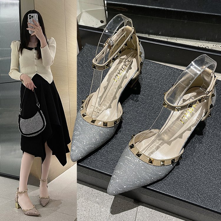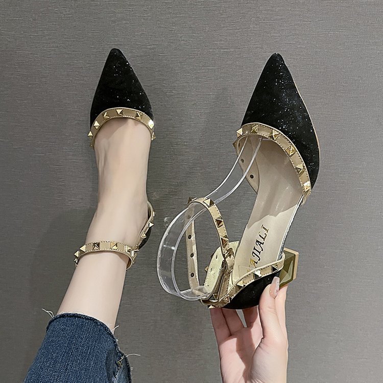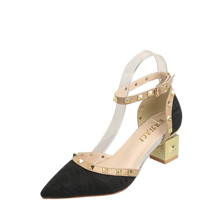 春季新款尖头单鞋粗跟中空一字搭扣高跟鞋时尚铆钉女鞋