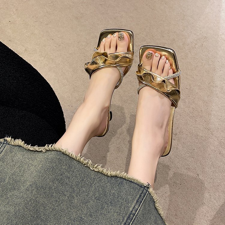 春季新款仙女细跟拖鞋外穿荷叶边水钻一字高跟鞋时尚女鞋