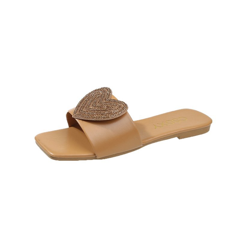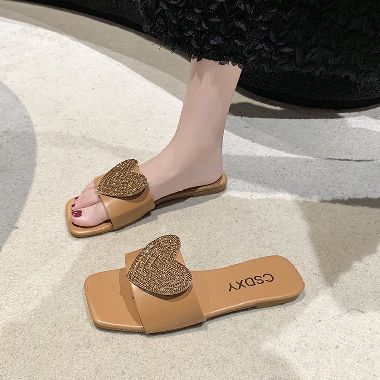 夏季新款大码平底拖鞋女水钻爱心方头露趾一字凉拖鞋