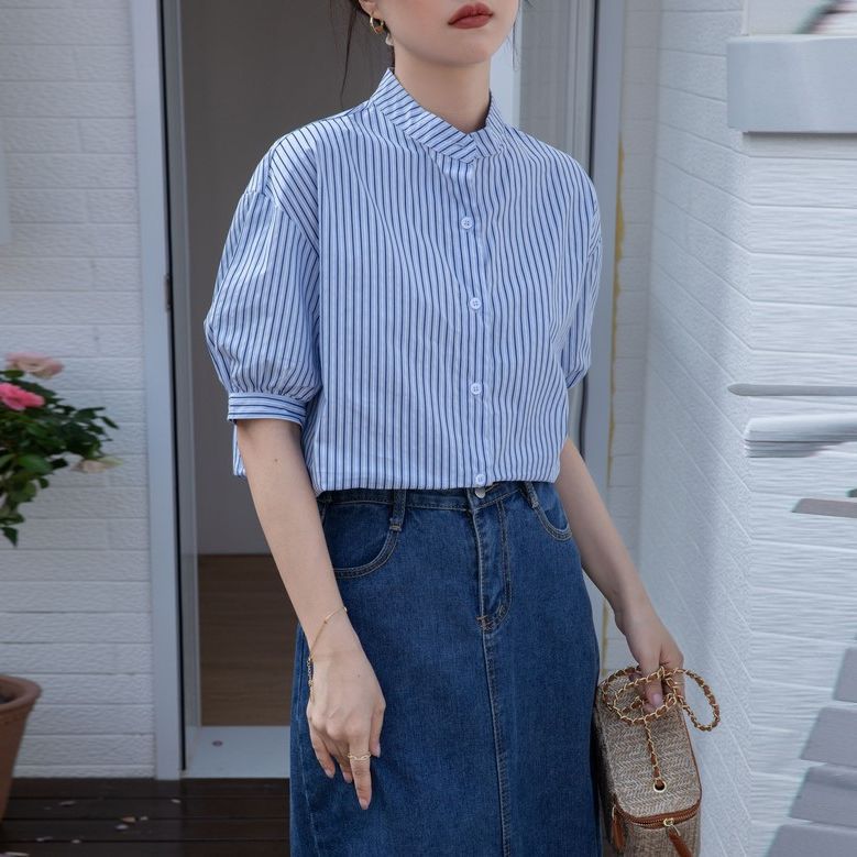 蓝色条纹夏设计感百搭宽松显瘦衬衣通勤衬衫女短袖经典衬衫女